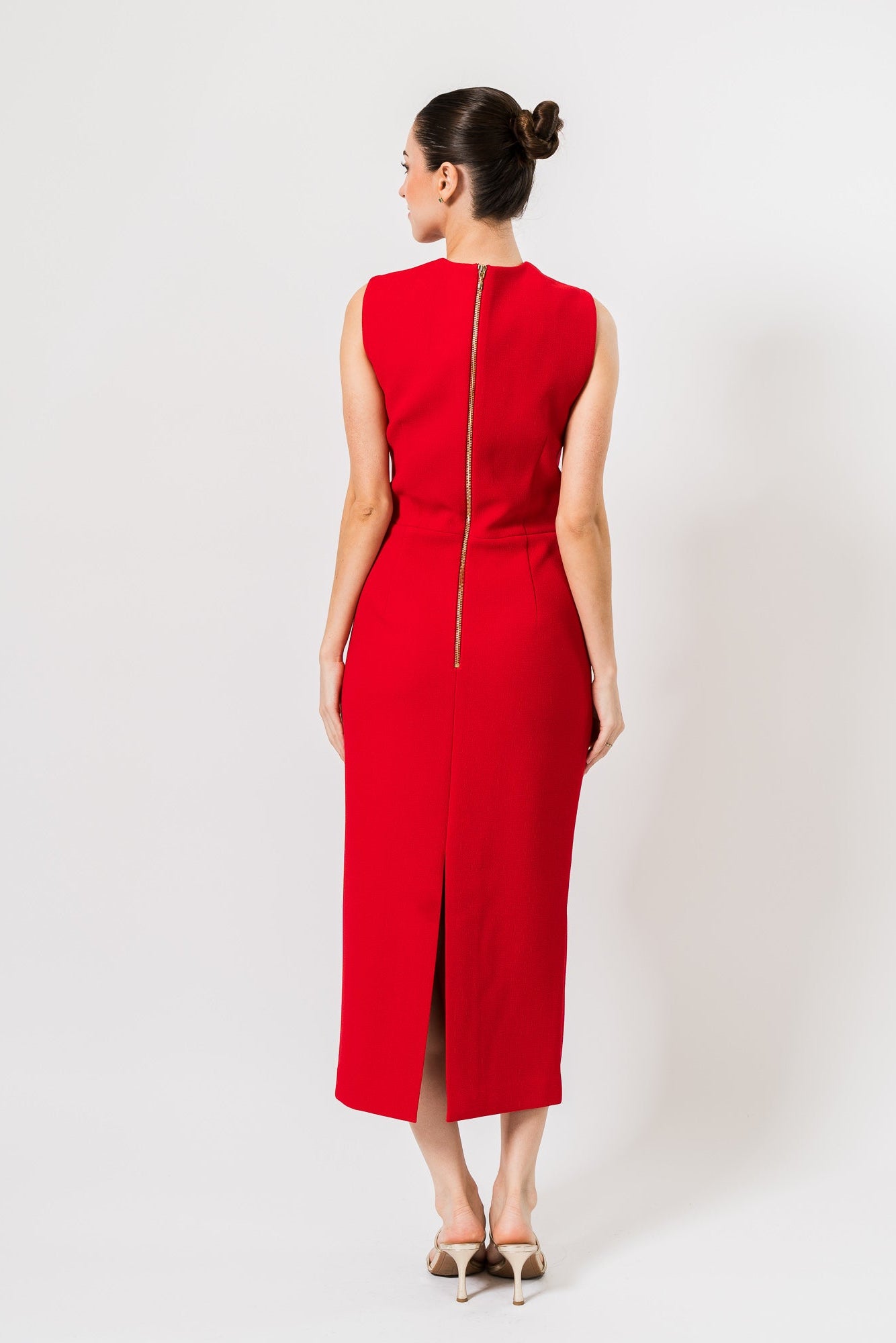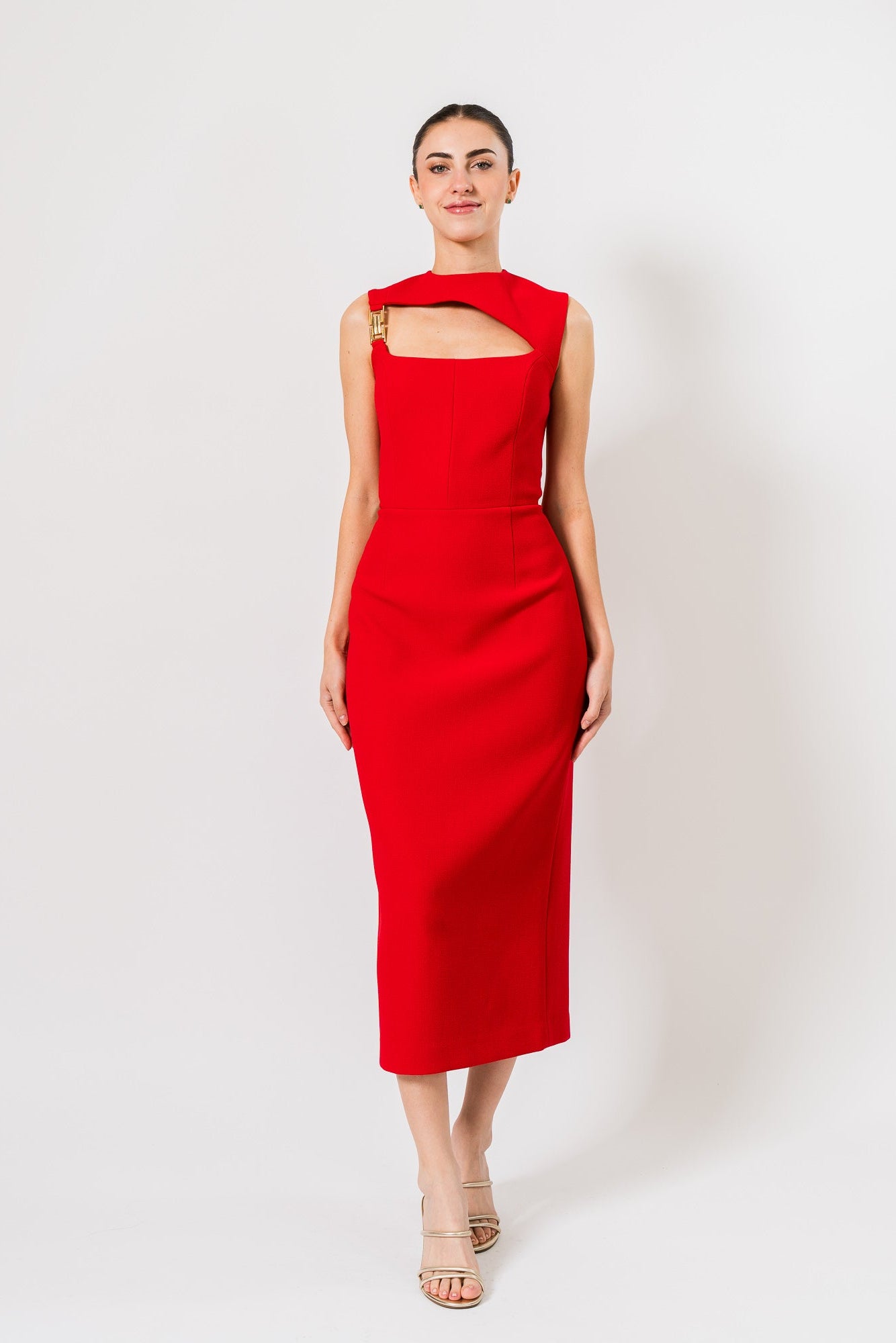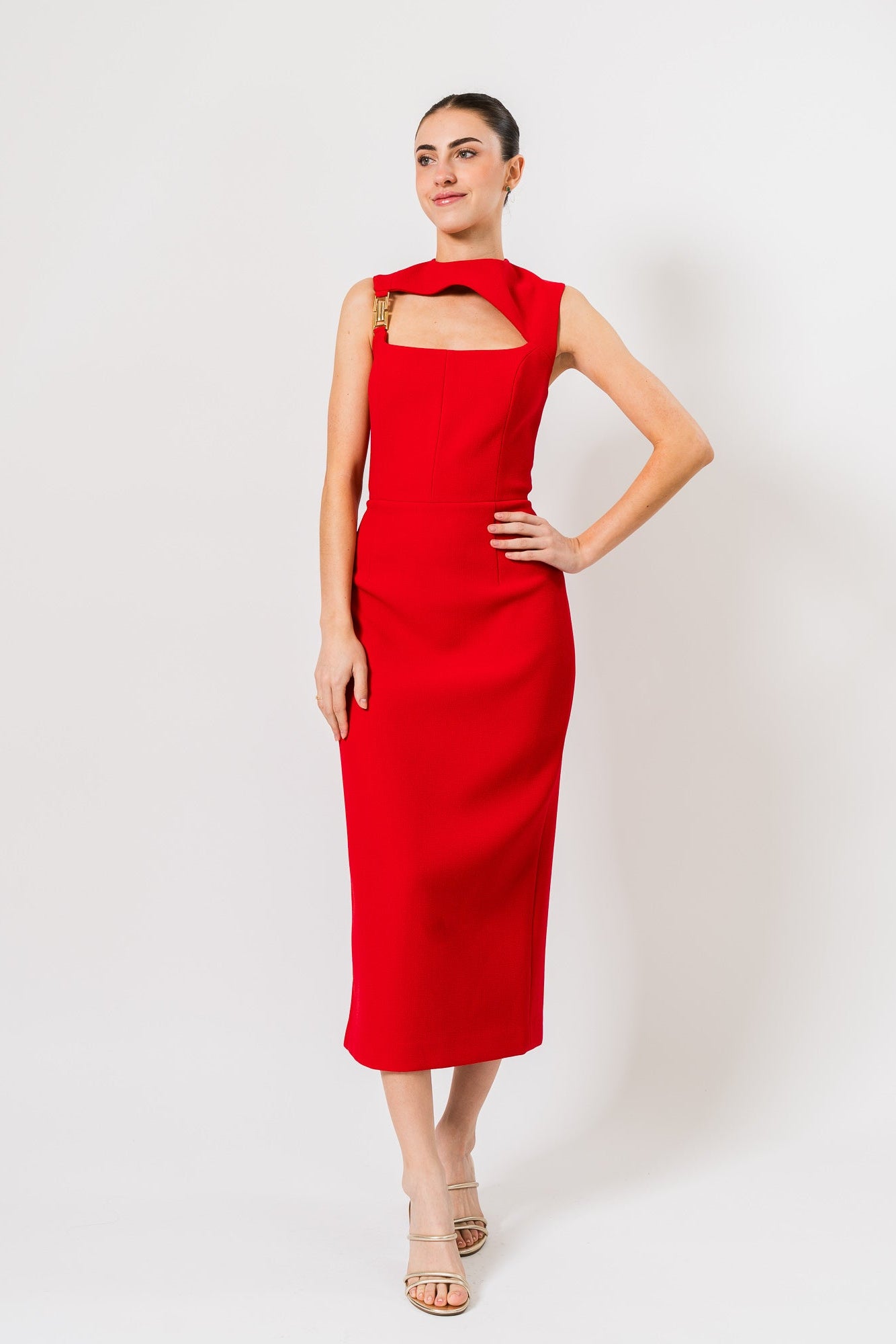 Cameron Asymetrical Midi Dress in Red by Rebecca Vallance.