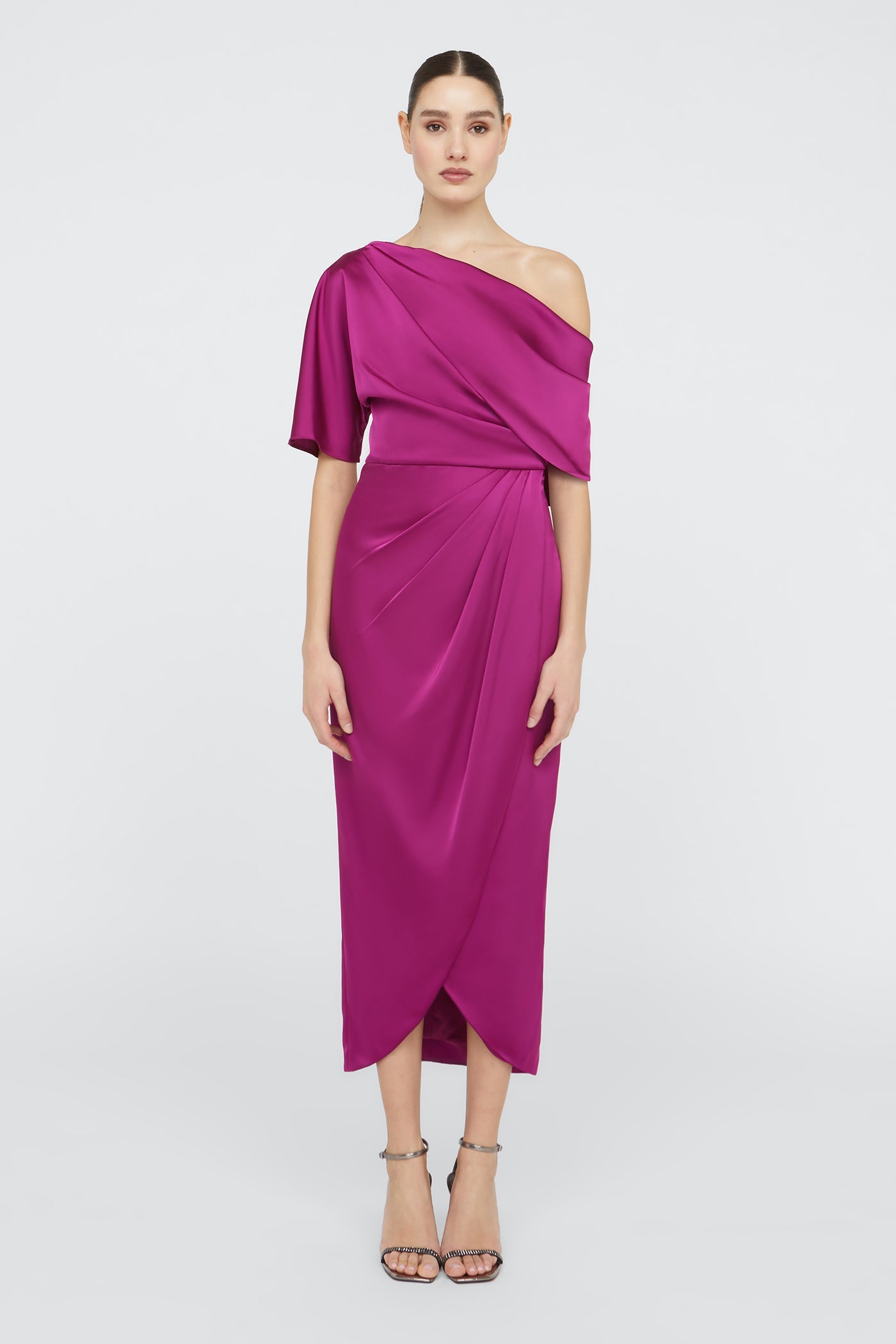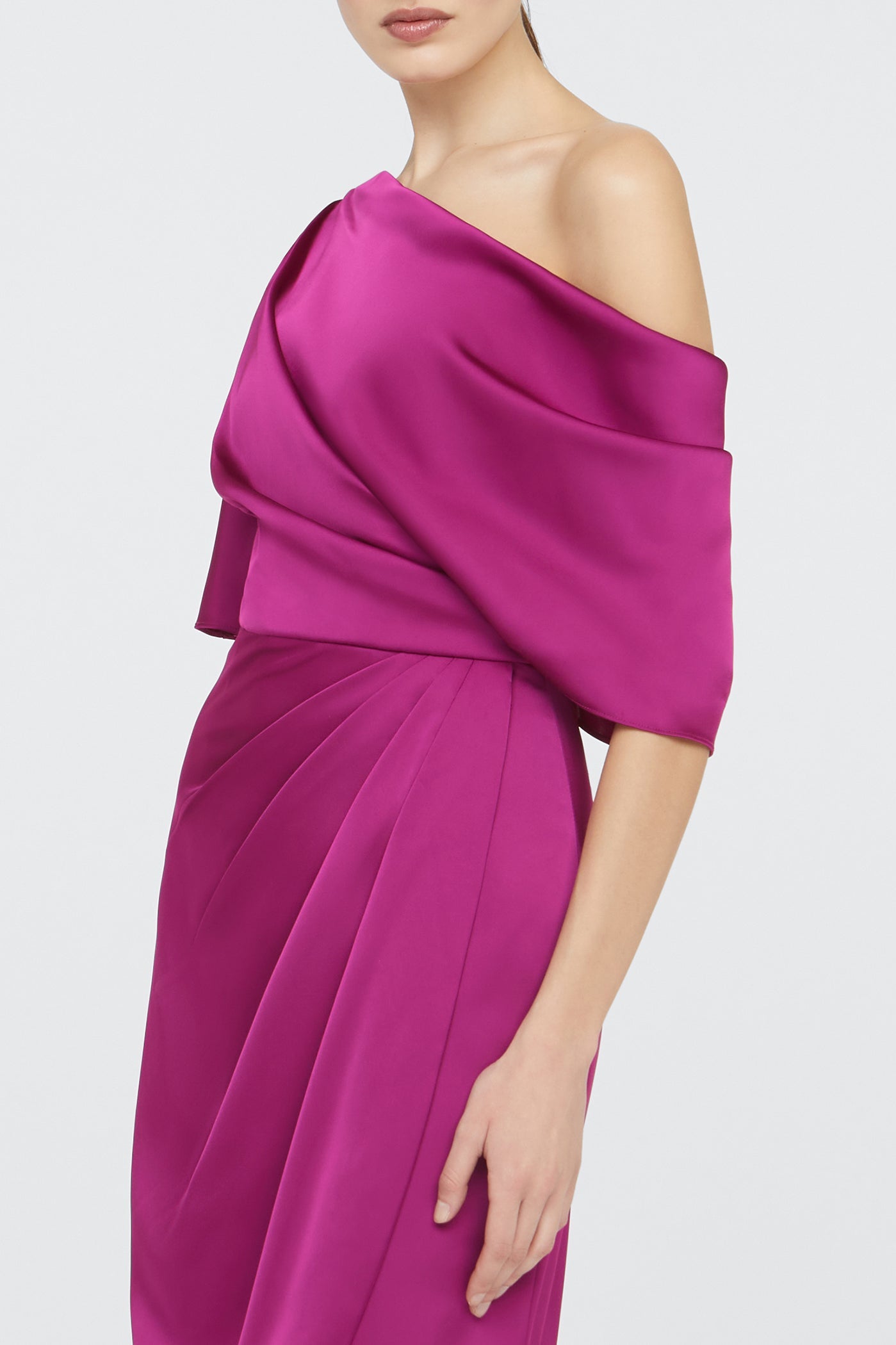 Satin Draped One Shoulder Gown With Faux Wrap Skirt in Sangria by Theia.