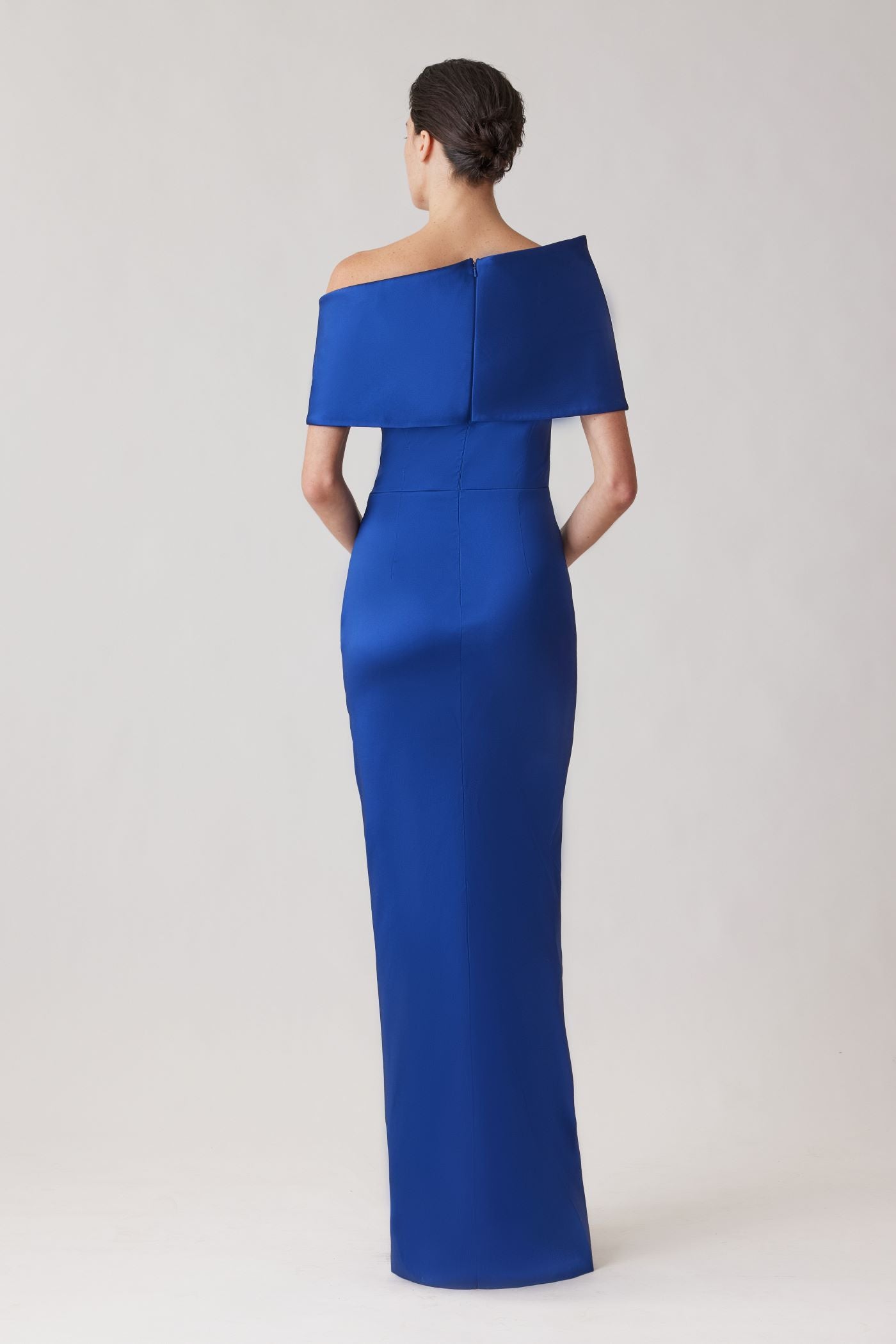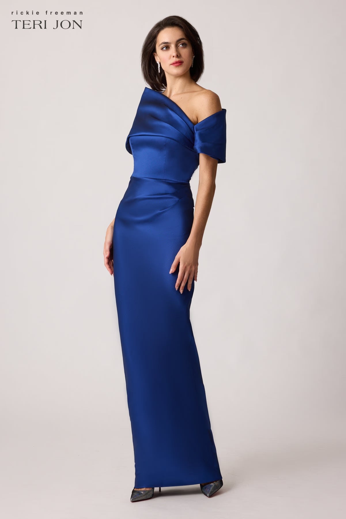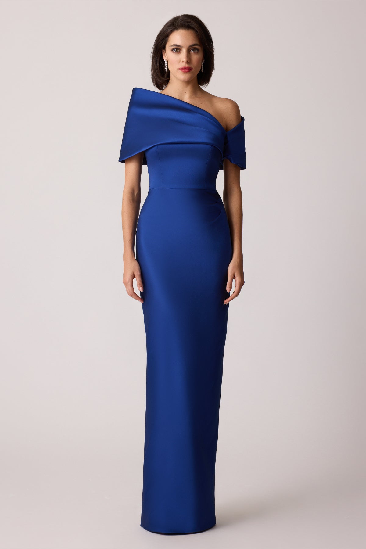 Stretch Mikado Asymmetrical Off Shoulder Cuff Gown in Sapphire by Teri Jon.