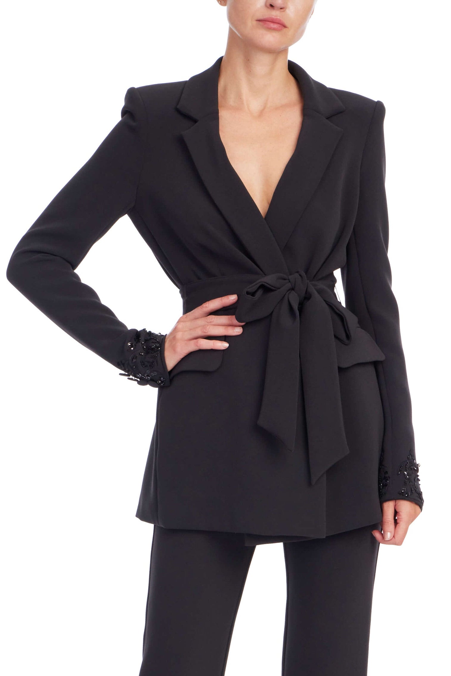 Beaded Back Panel Wrap Blazer in Black by Badgley Mischka.