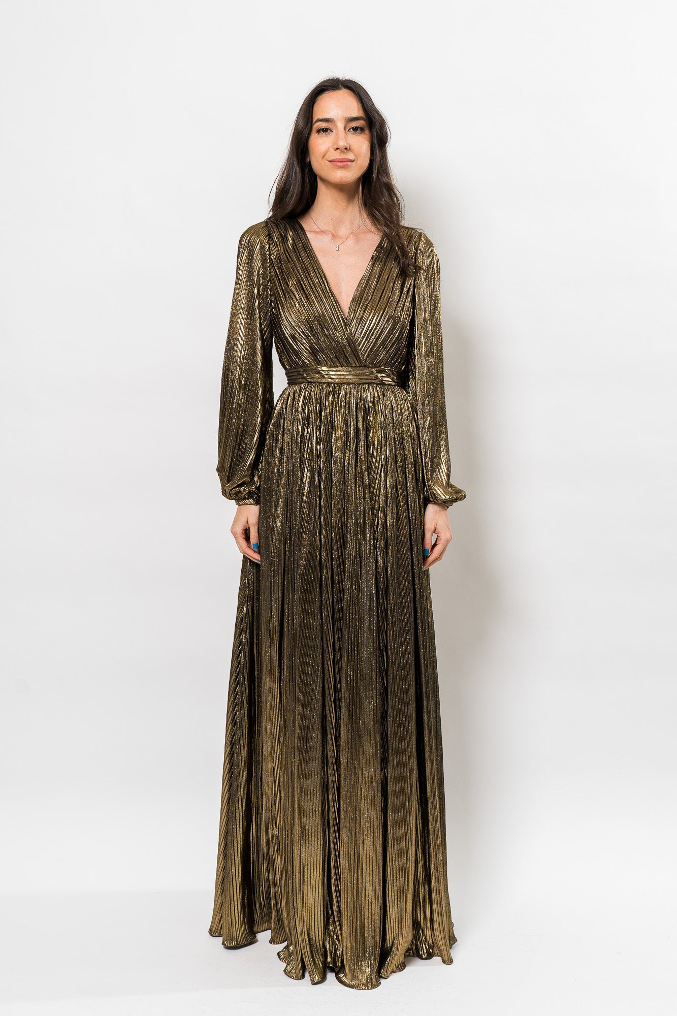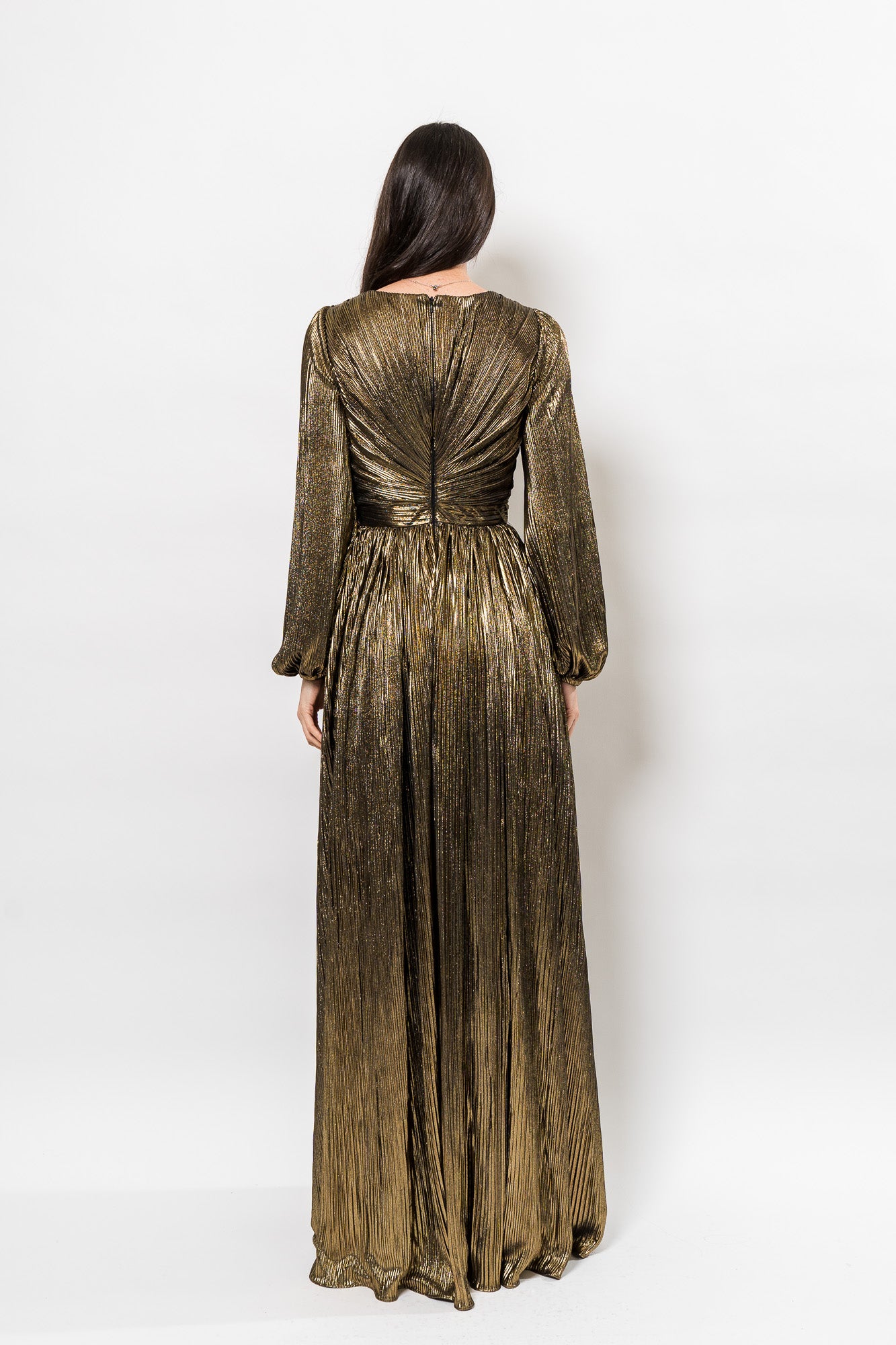 V-Neck Foil Pleated Gown in Gold by Badgley Mischka.