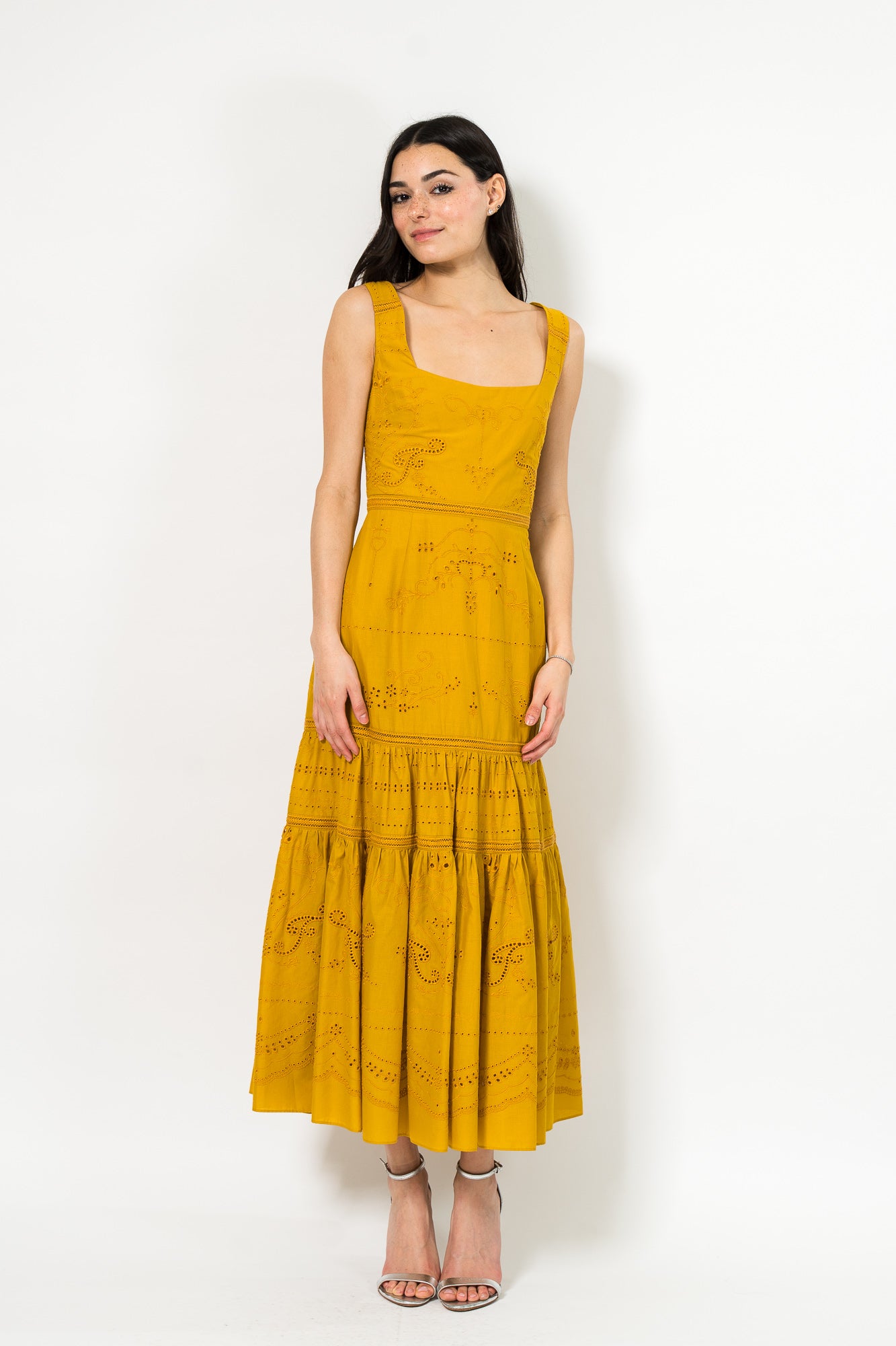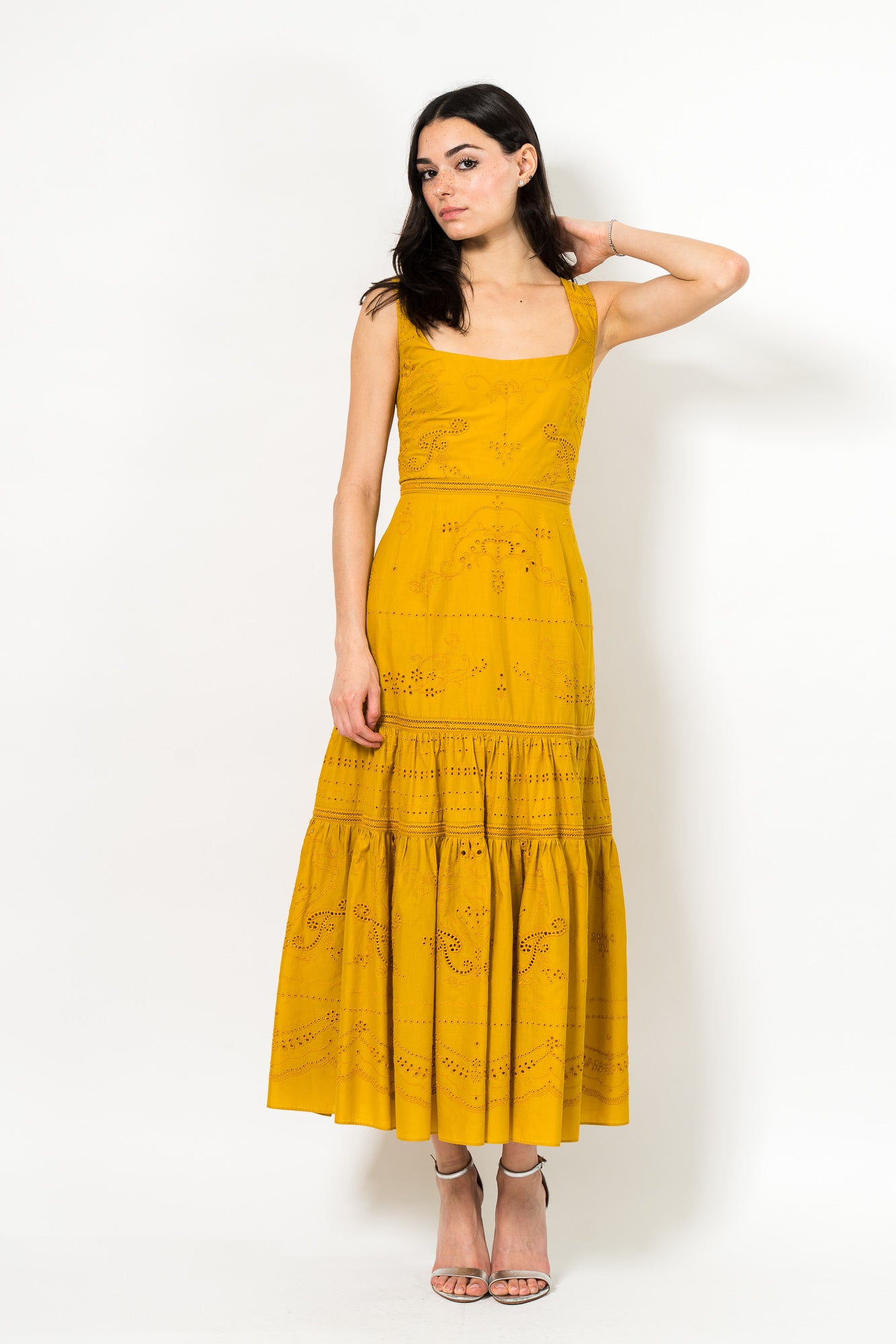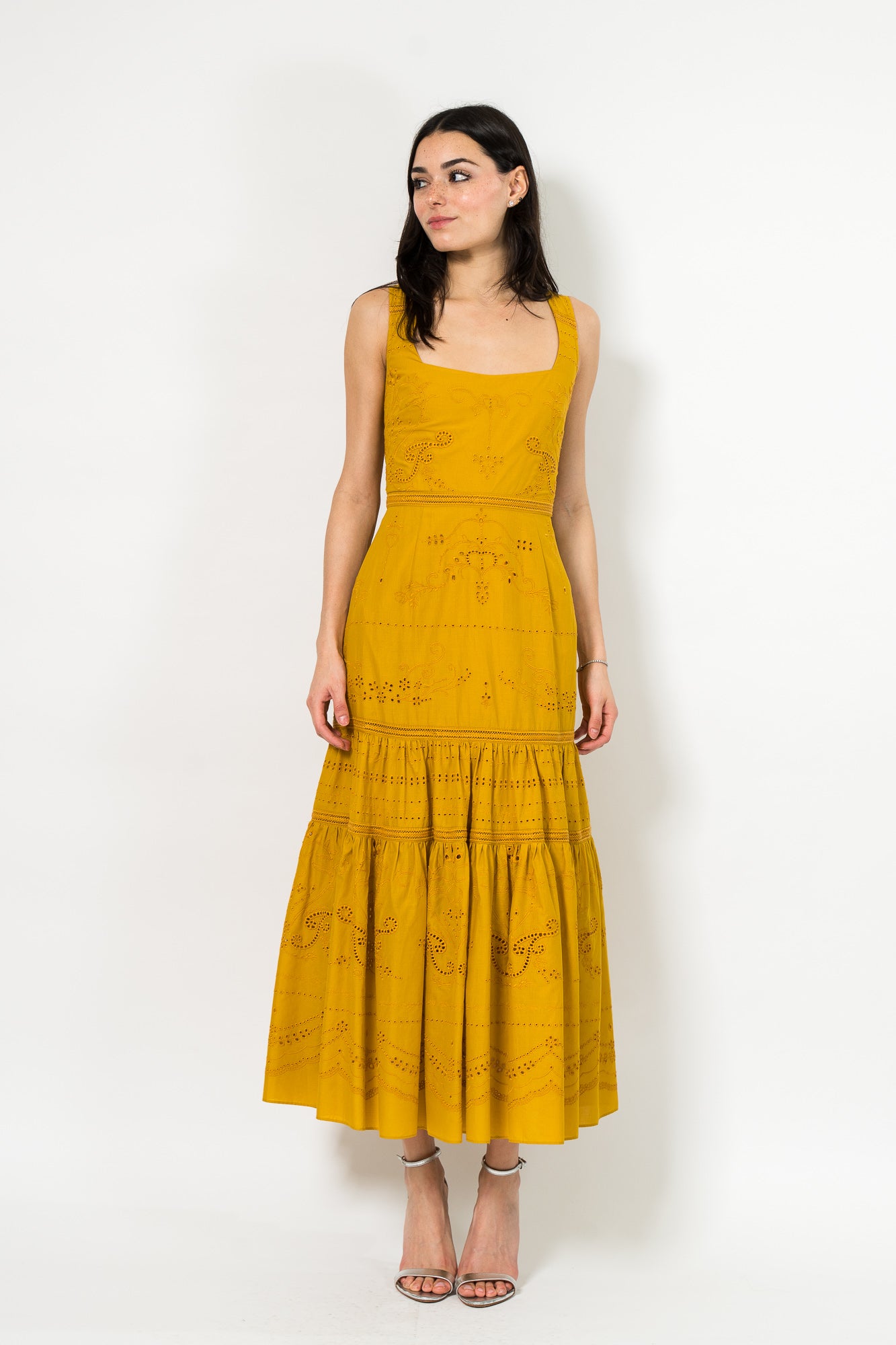 Embroidered Cotton Voile Sleeveless Tiered Maxi Dress With Women Lattice Trim Details in Mustard by Marchesa Rosa.