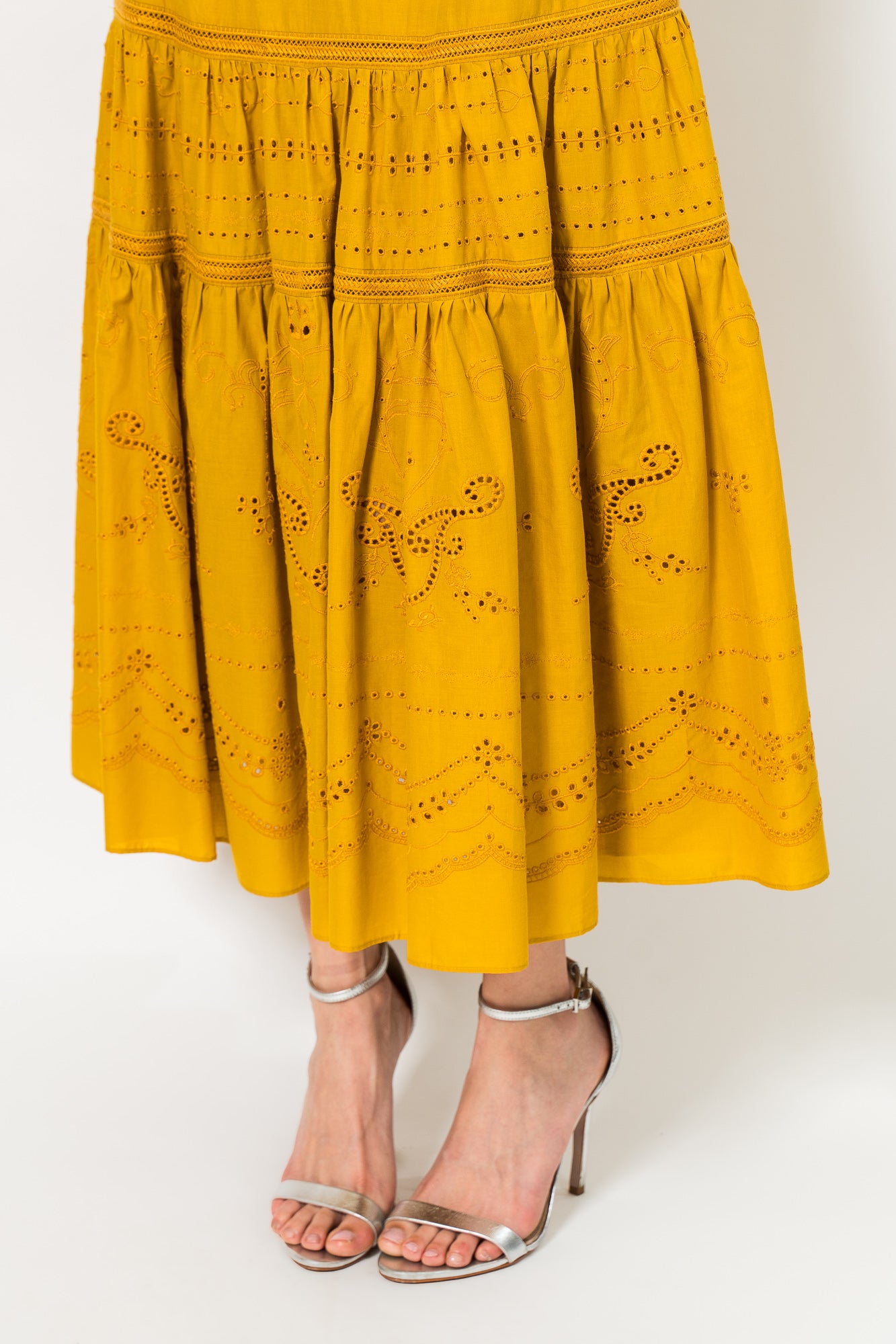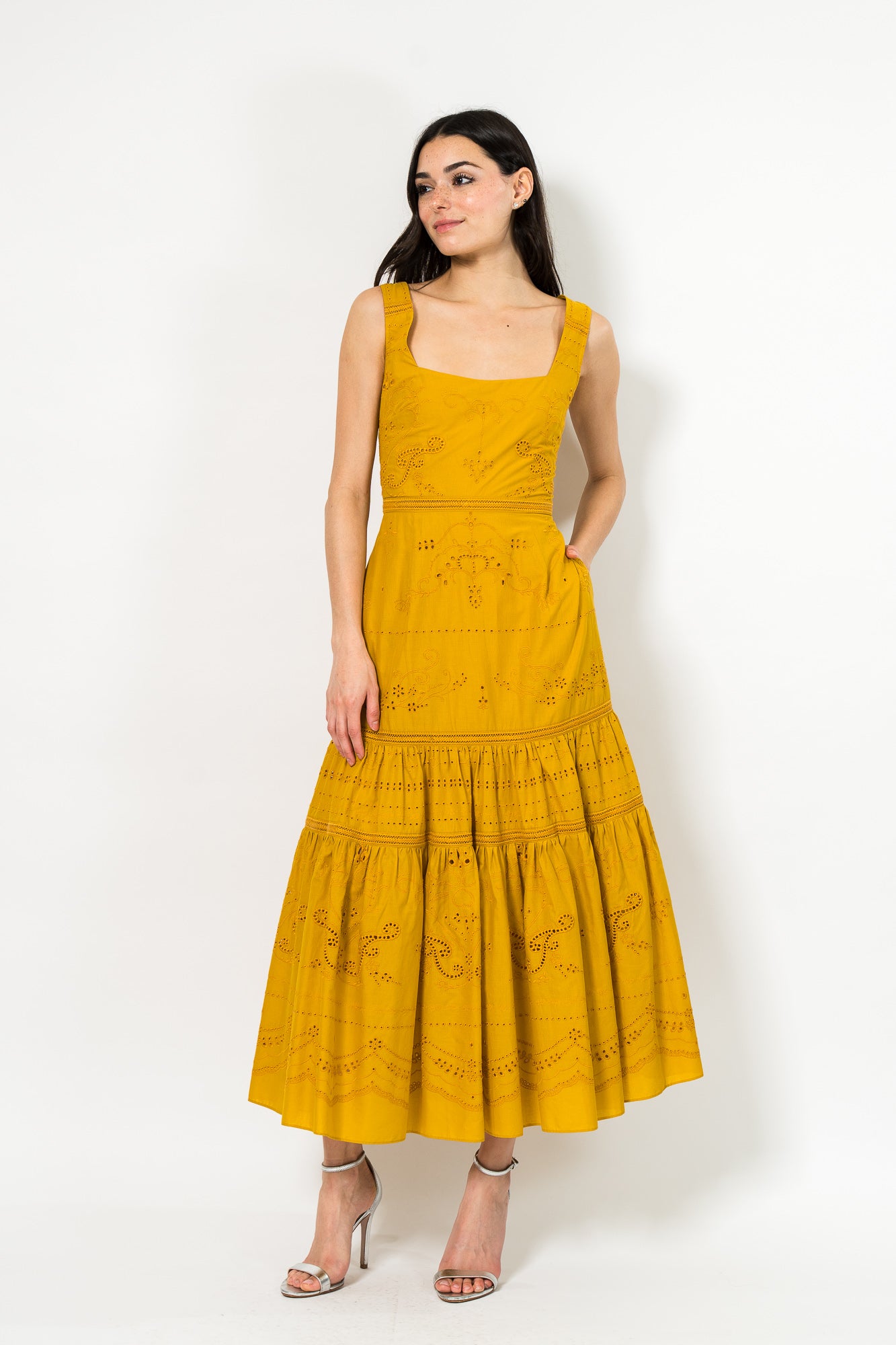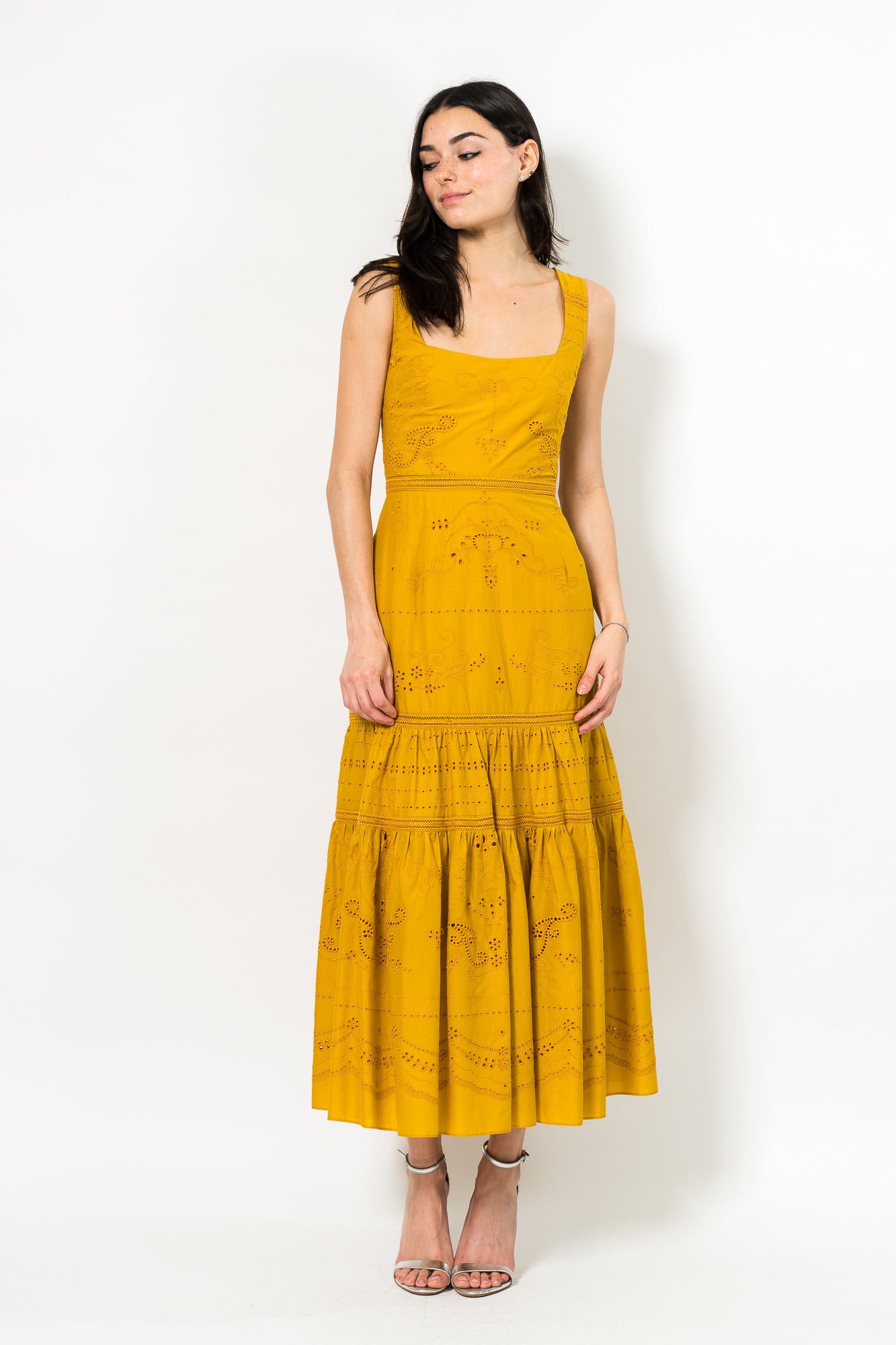 Embroidered Cotton Voile Sleeveless Tiered Maxi Dress With Women Lattice Trim Details in Mustard by Marchesa Rosa.