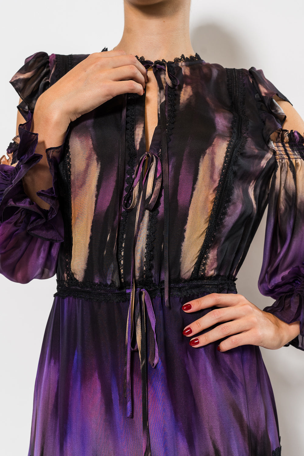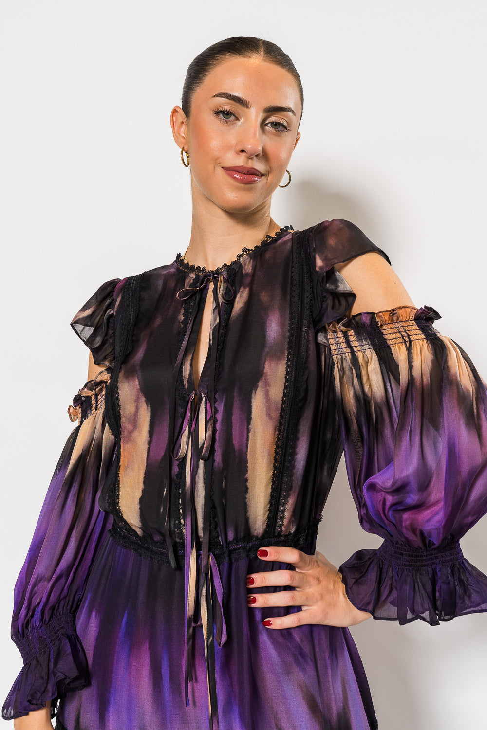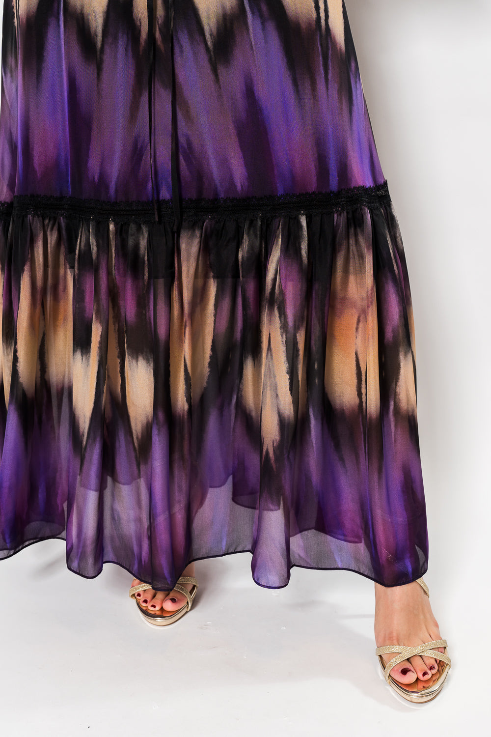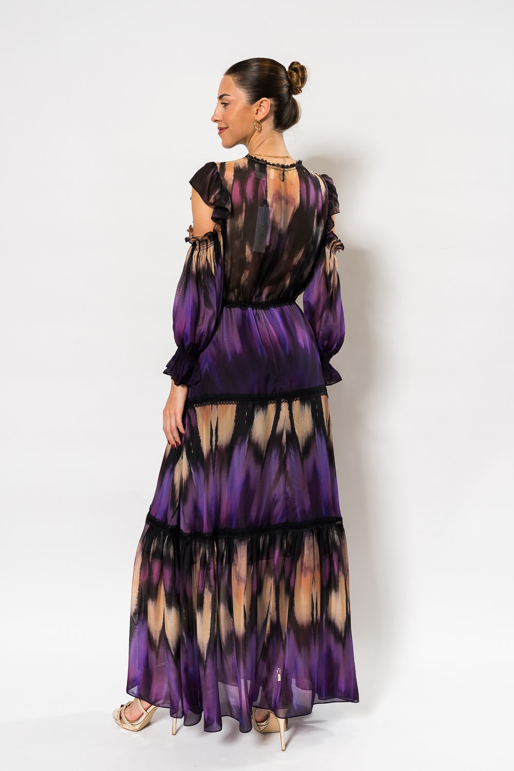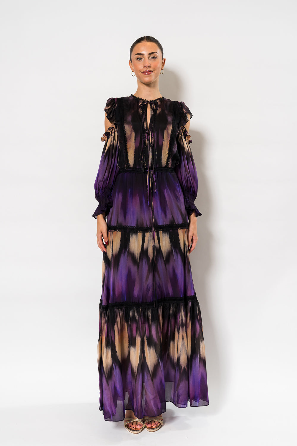 Abstract Print Silk Viscose Maxi Dress With Tied Front Details, Ruffled Cold Shoulder Smocked Cuff, Tiered Body With Hem Ruffle, And Delicate lace Trims in Purple Multi by Marchesa Rosa.