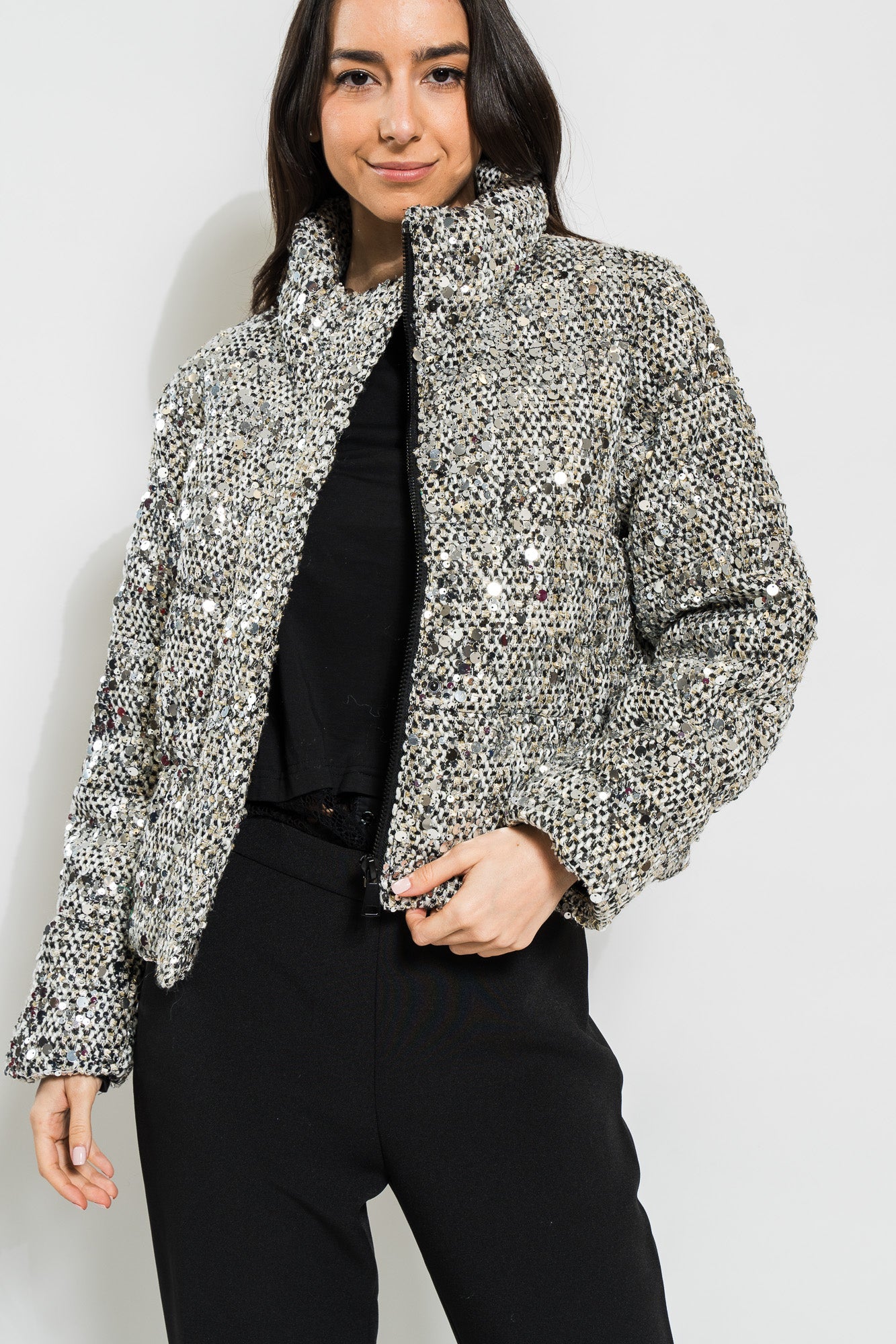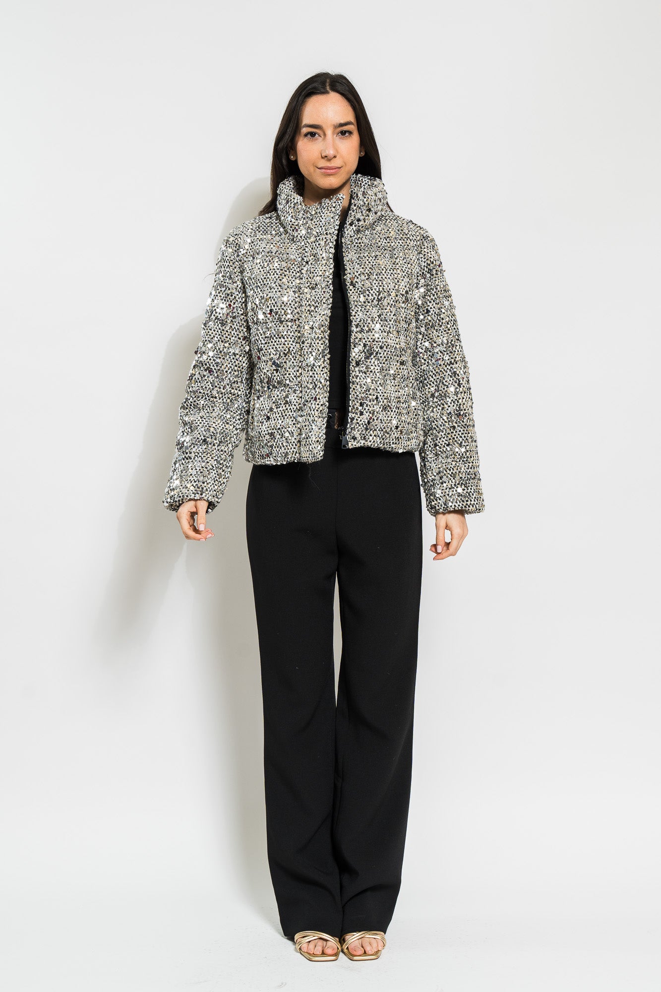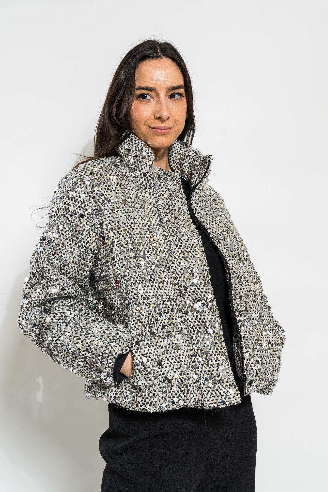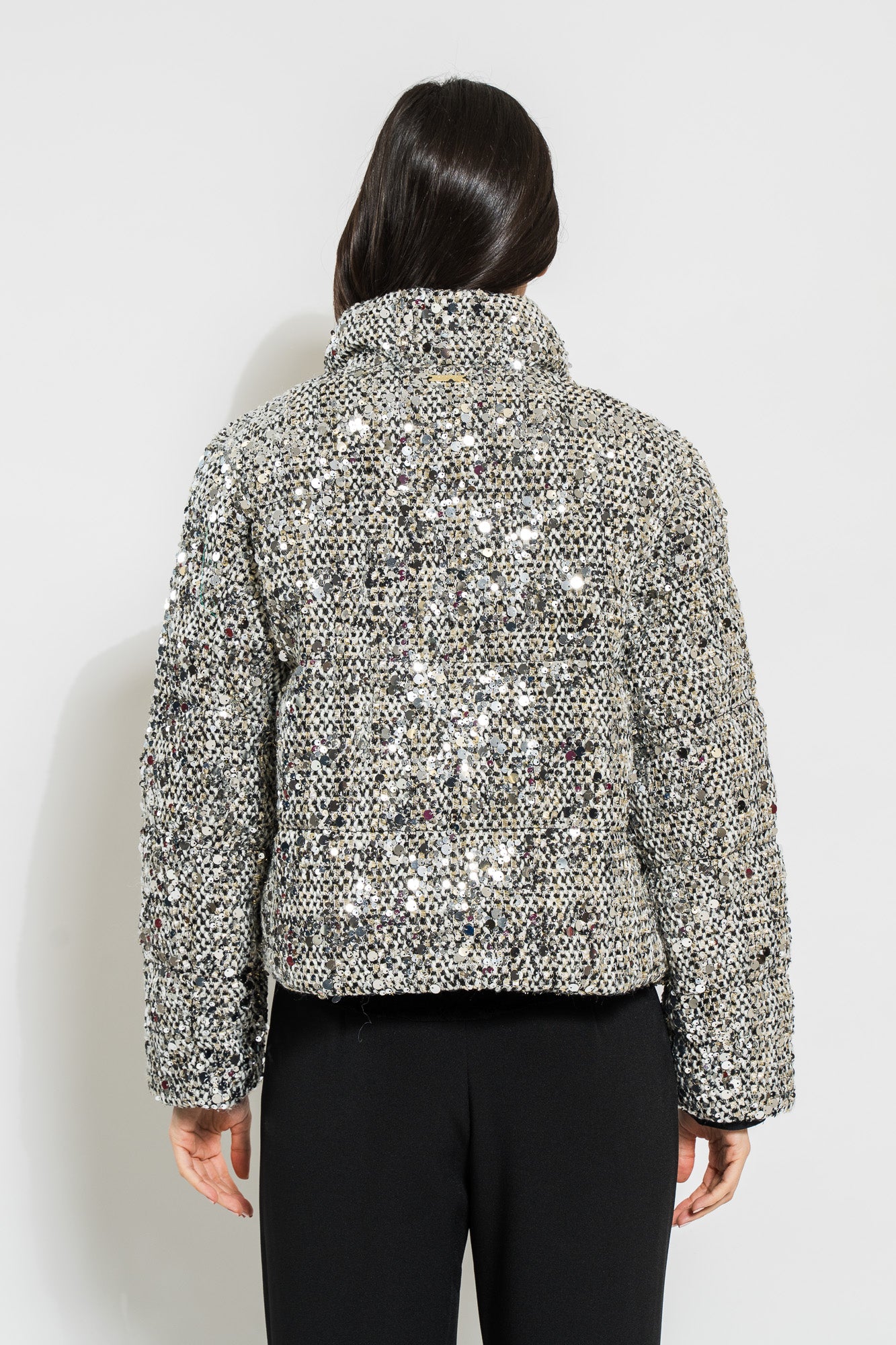 Hayes Sequins Tweed Puffer in Silver by Milly.