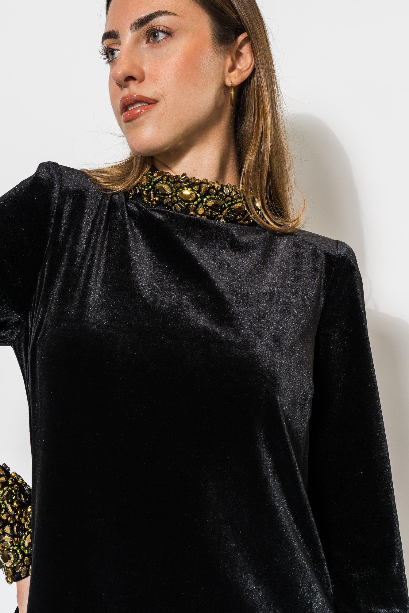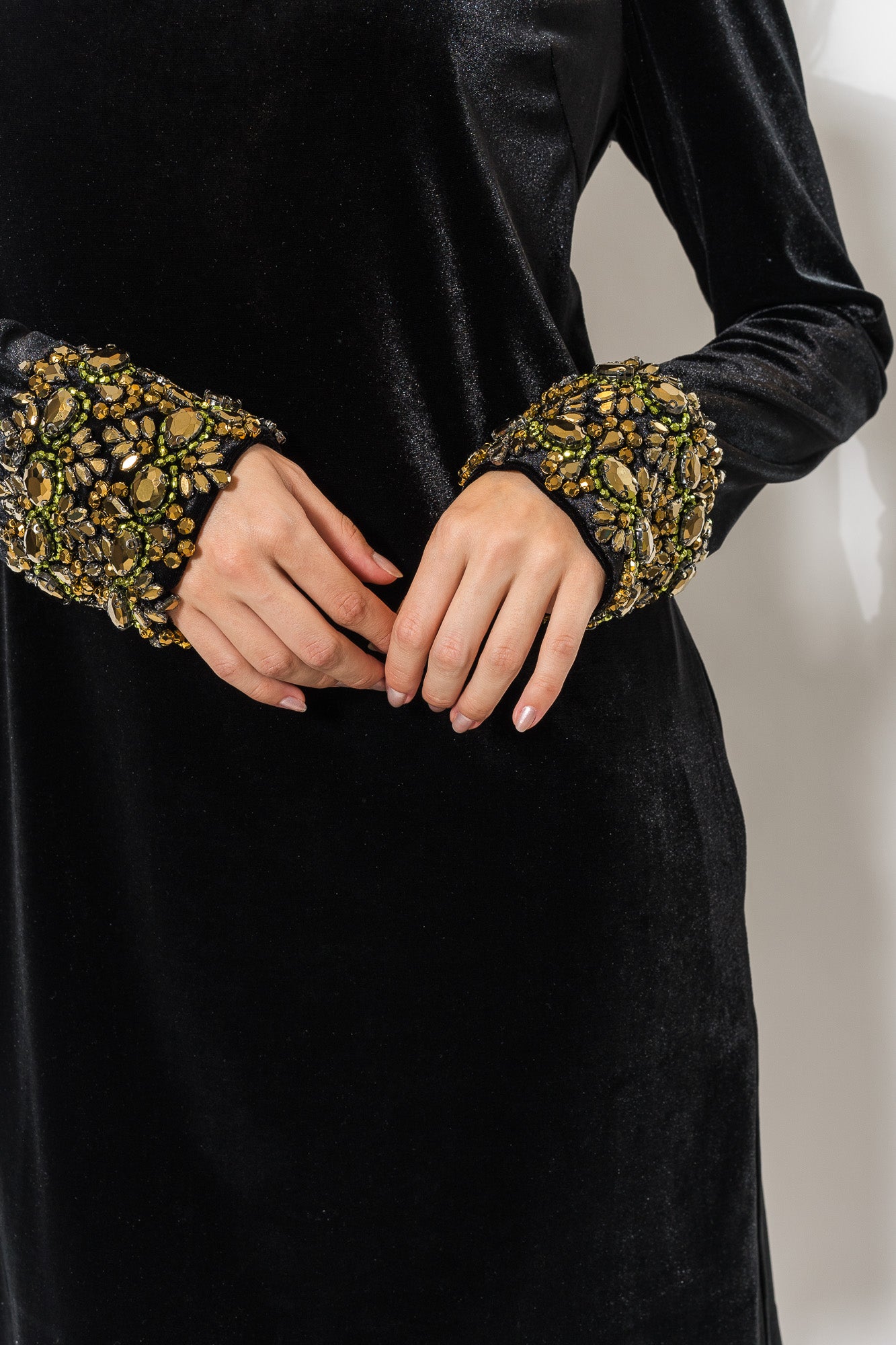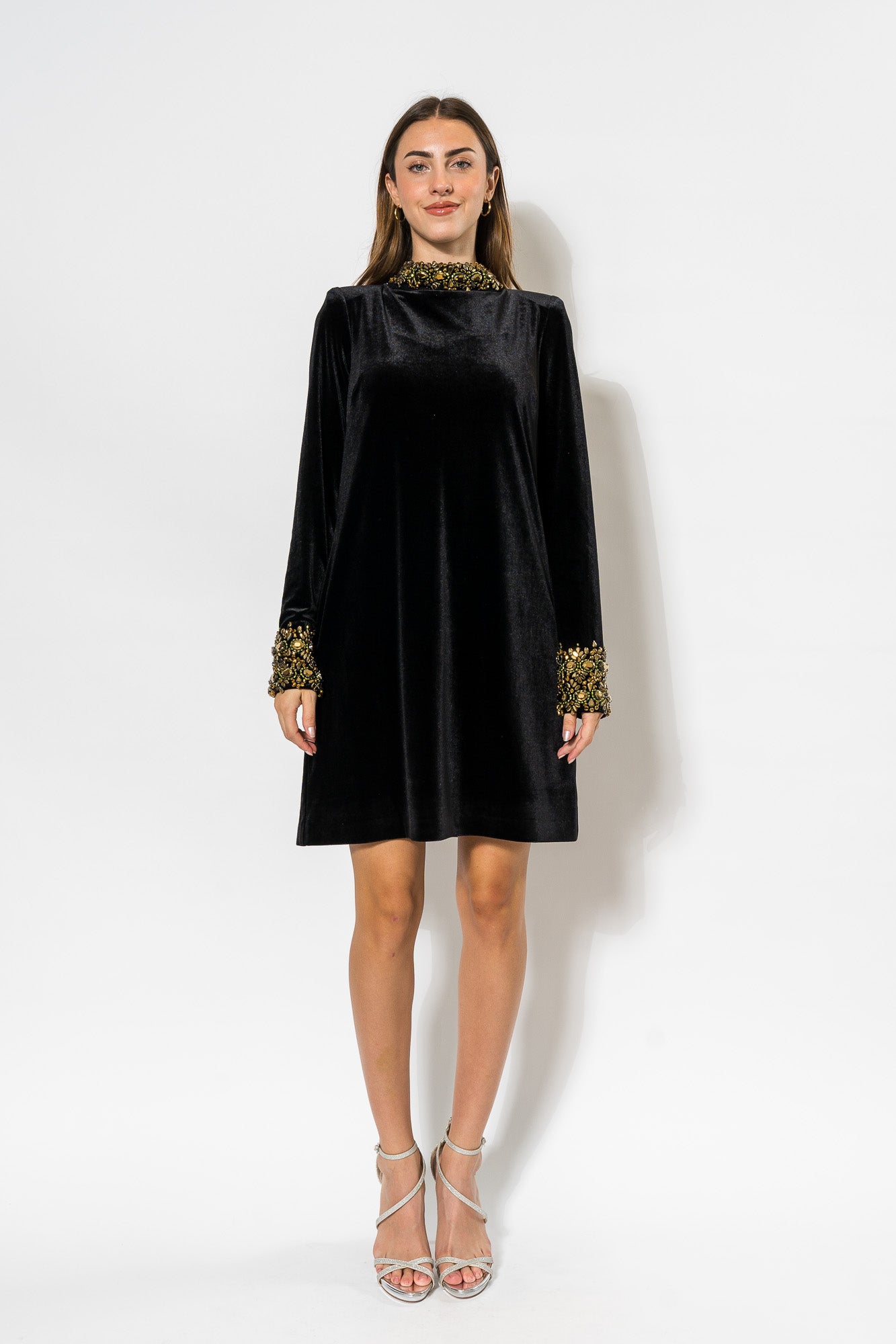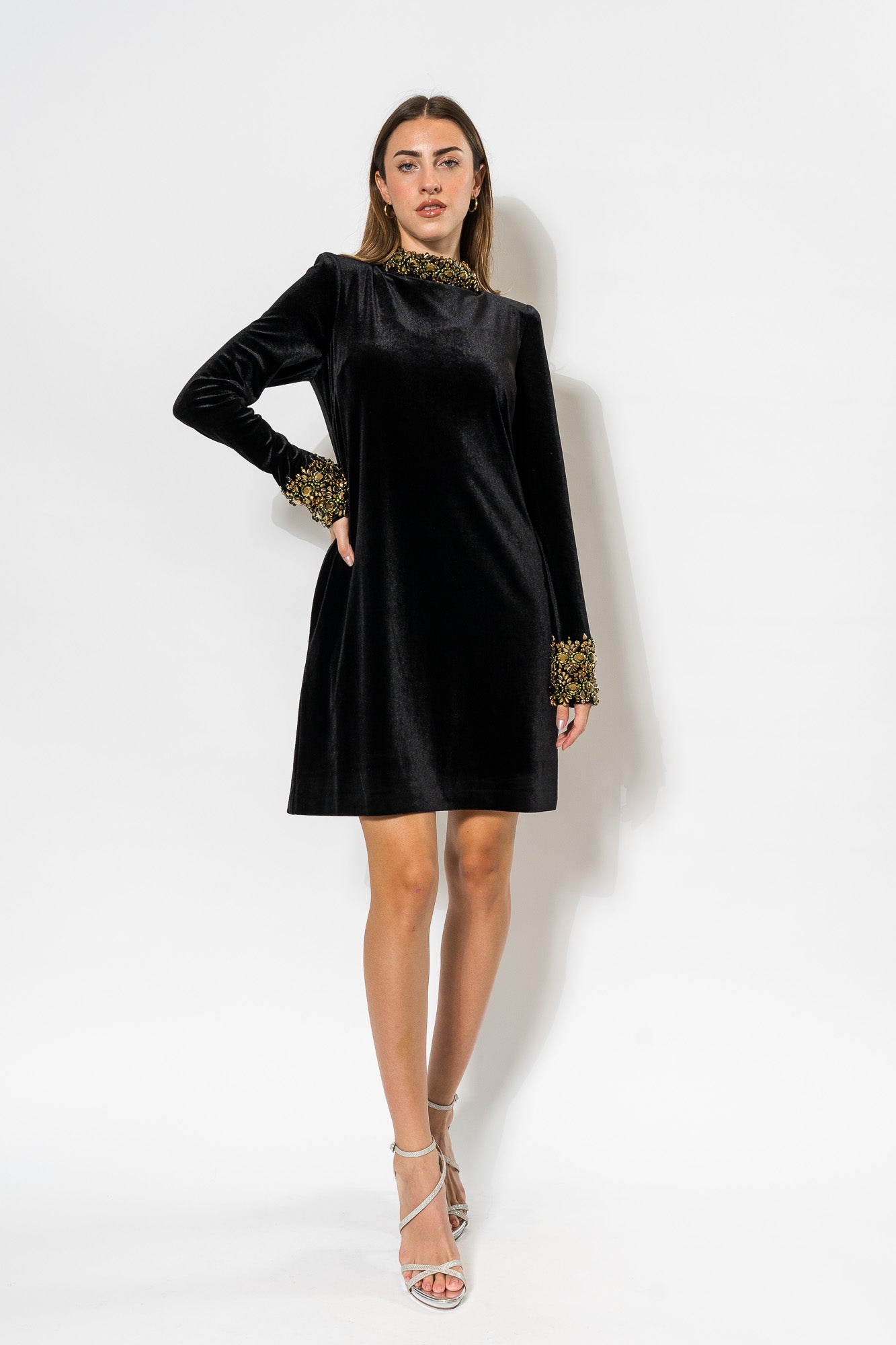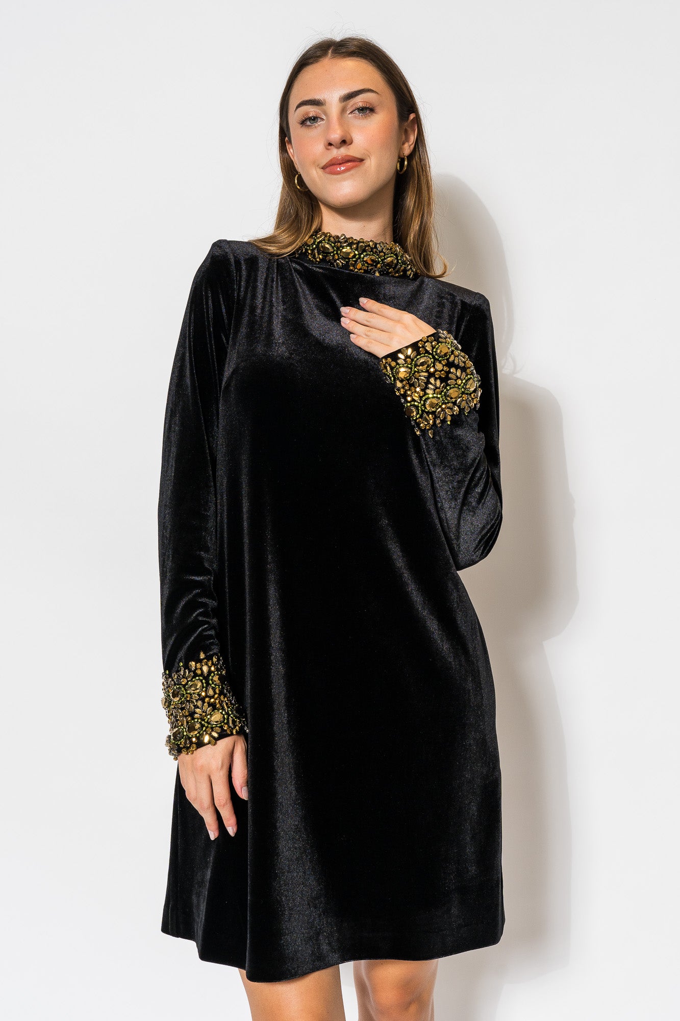 Long Sleeve Shift Dress with Beading Detail in Black by Badgley Mischka.