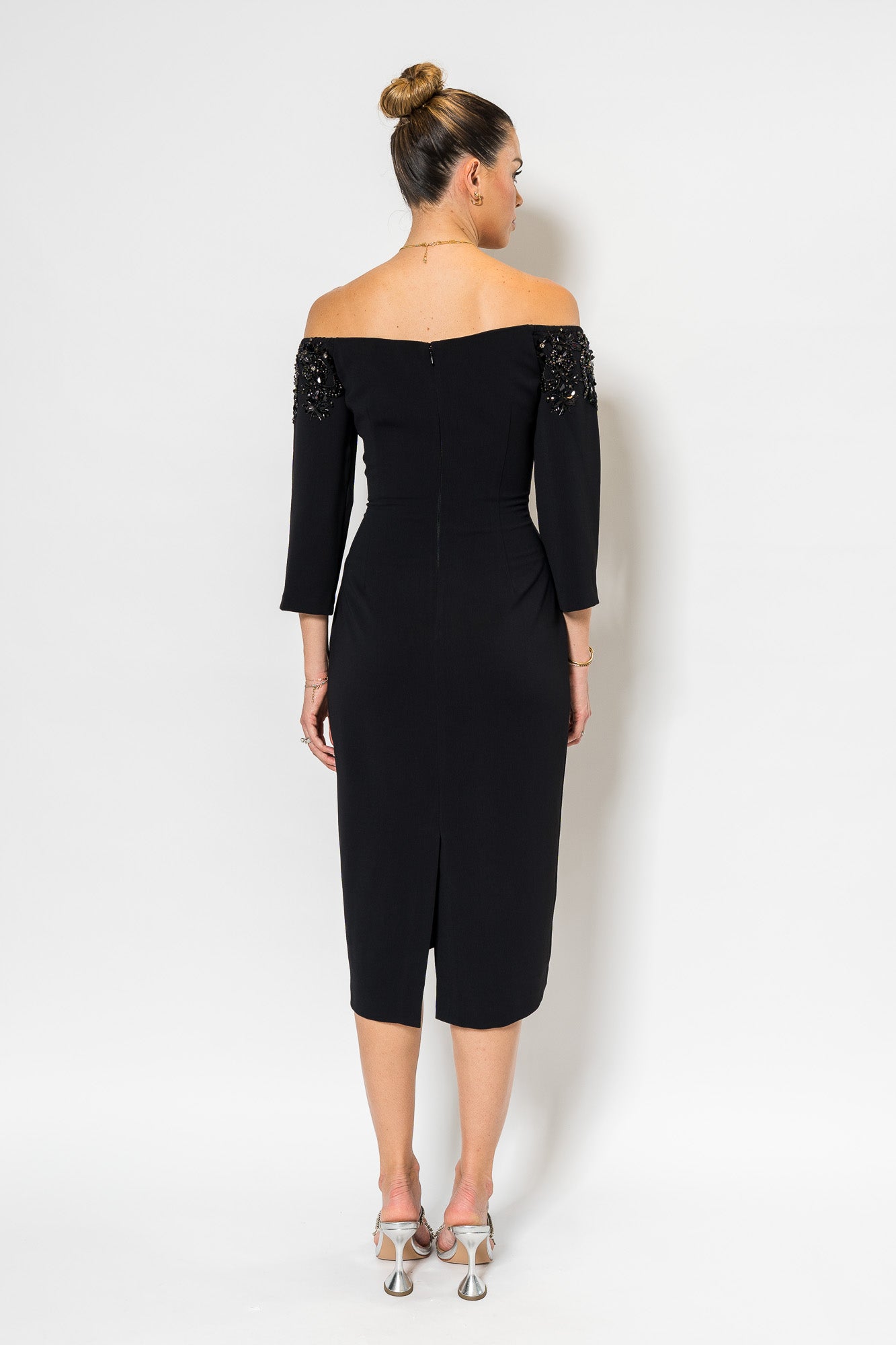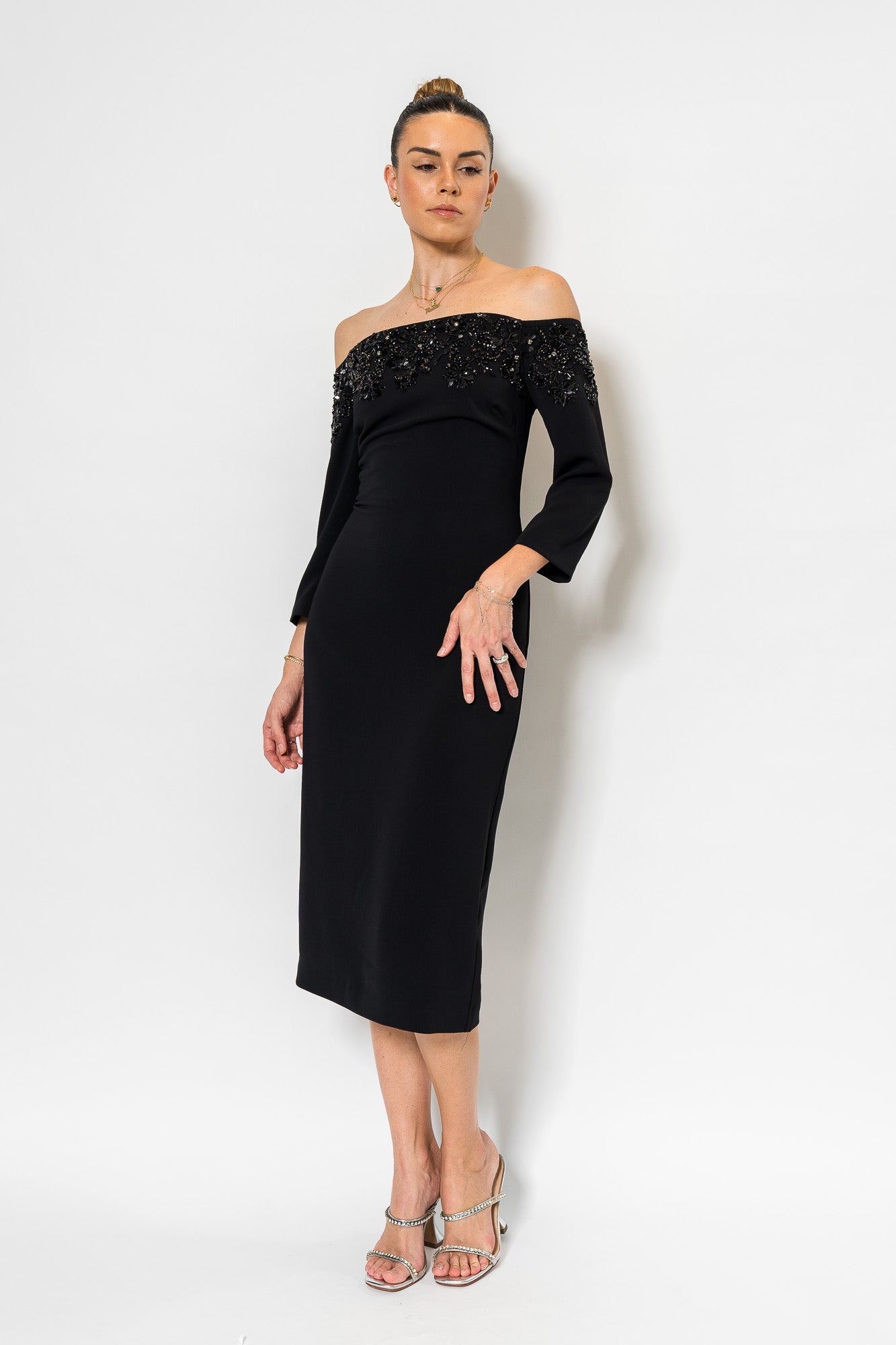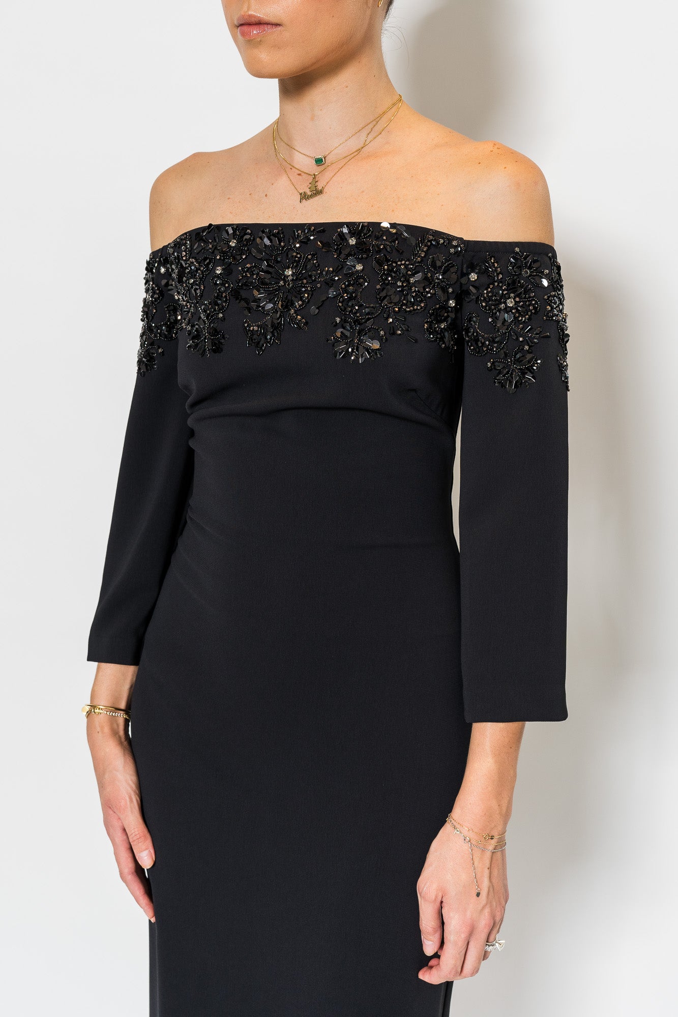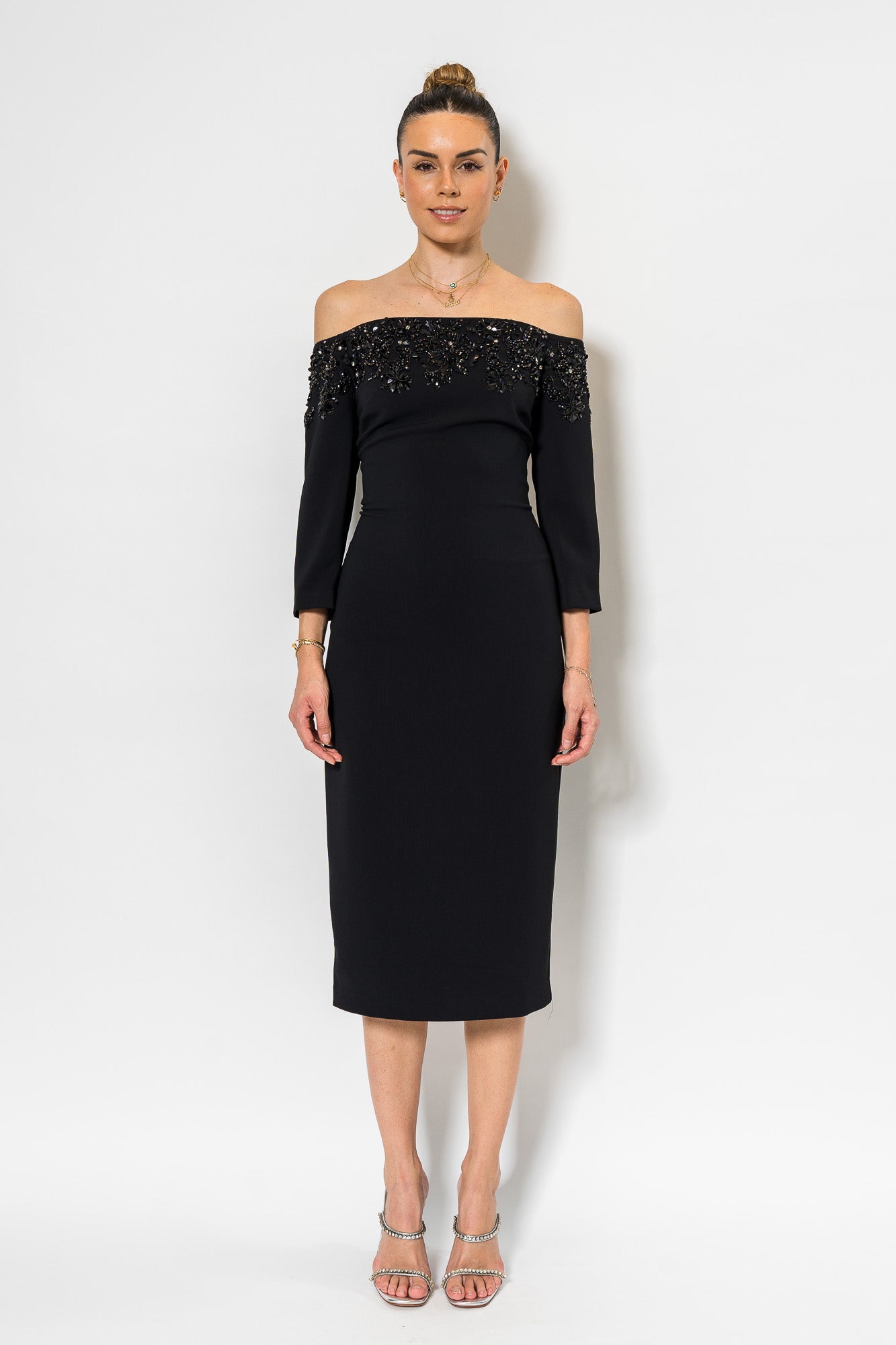 Embellished Boatneck Fitted Cocktail Dress in Black by Badgley Mischka.