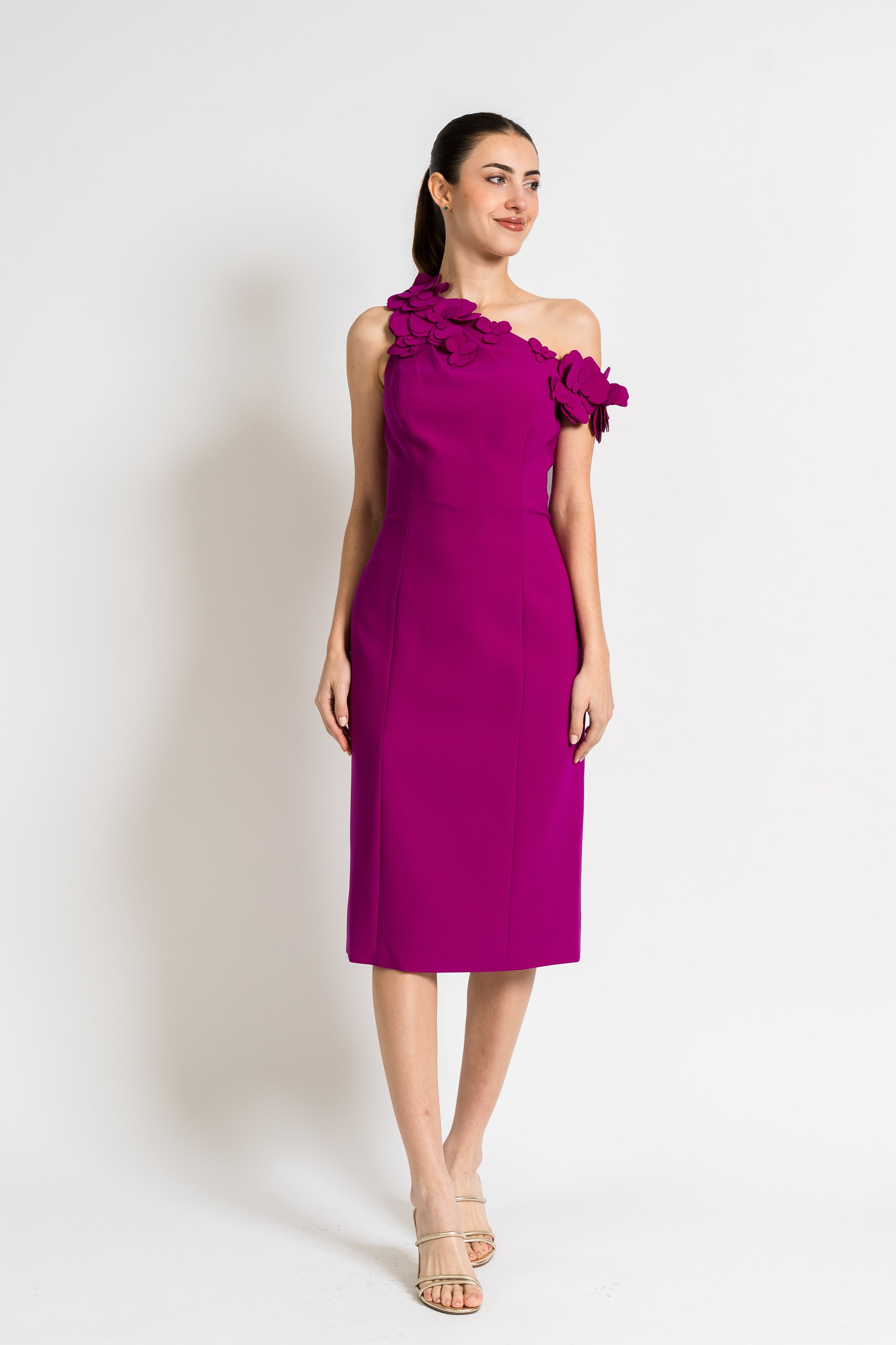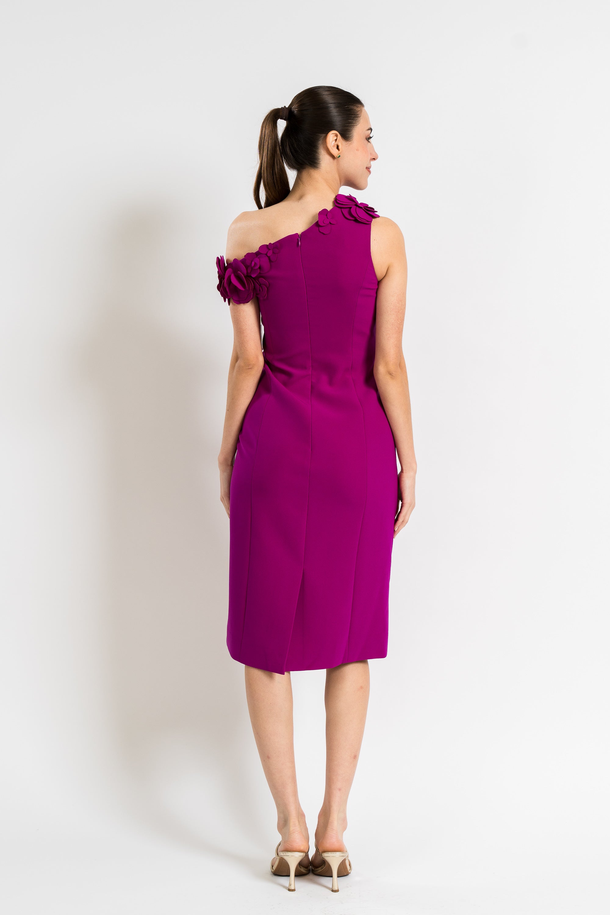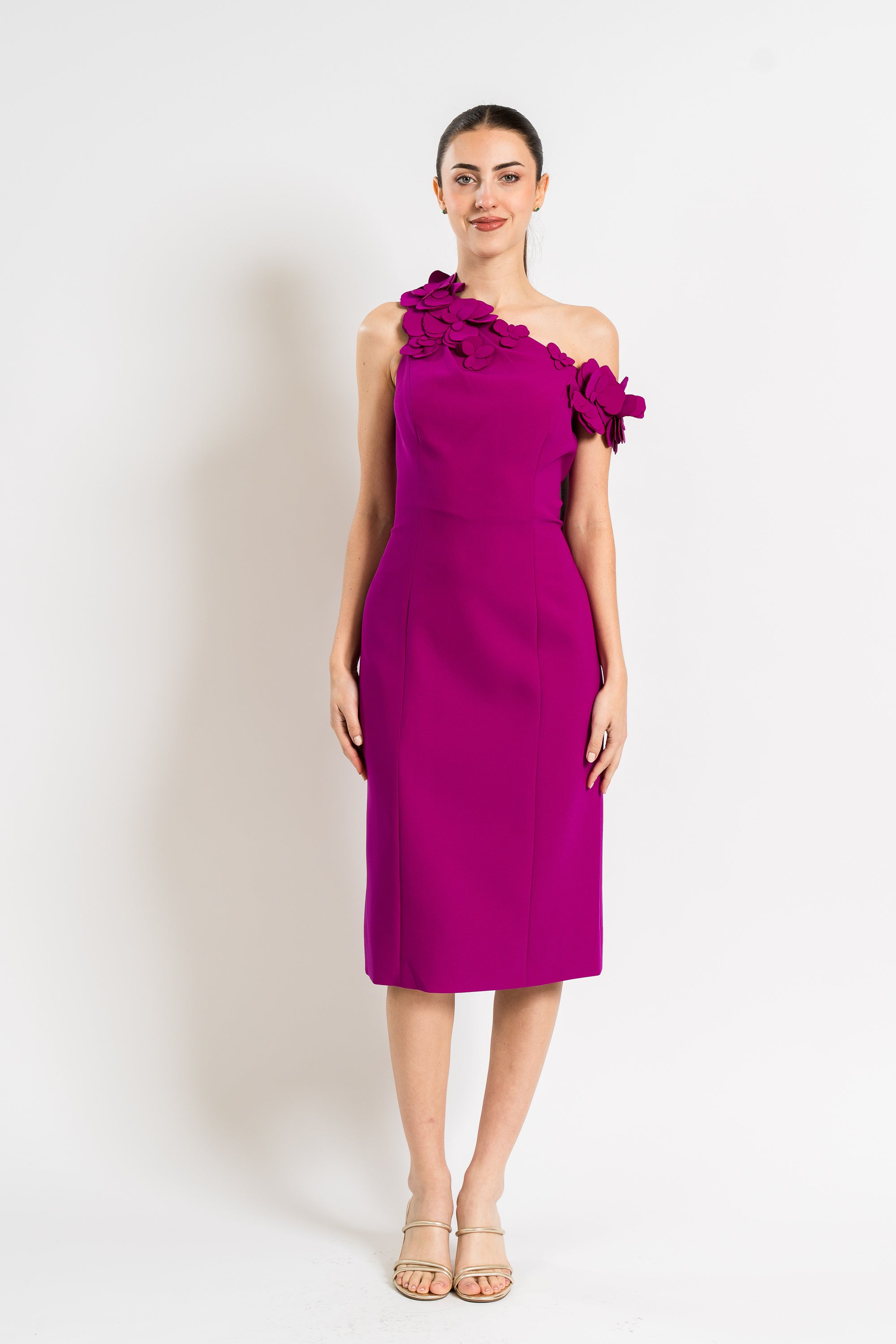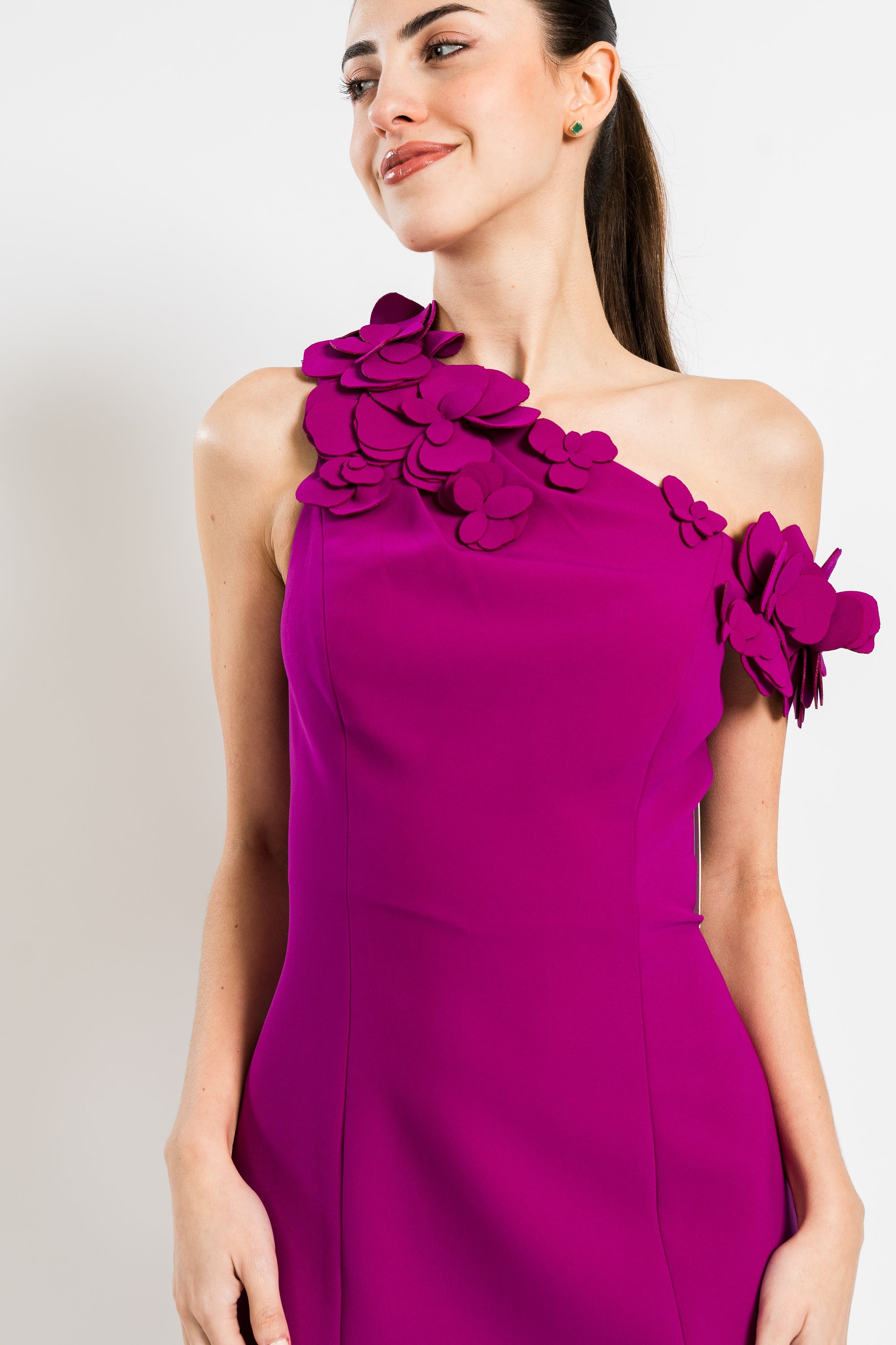 Stretch Crepe 3D Flower Asymmetrical Shoulder in Cerise by Teri Jon.