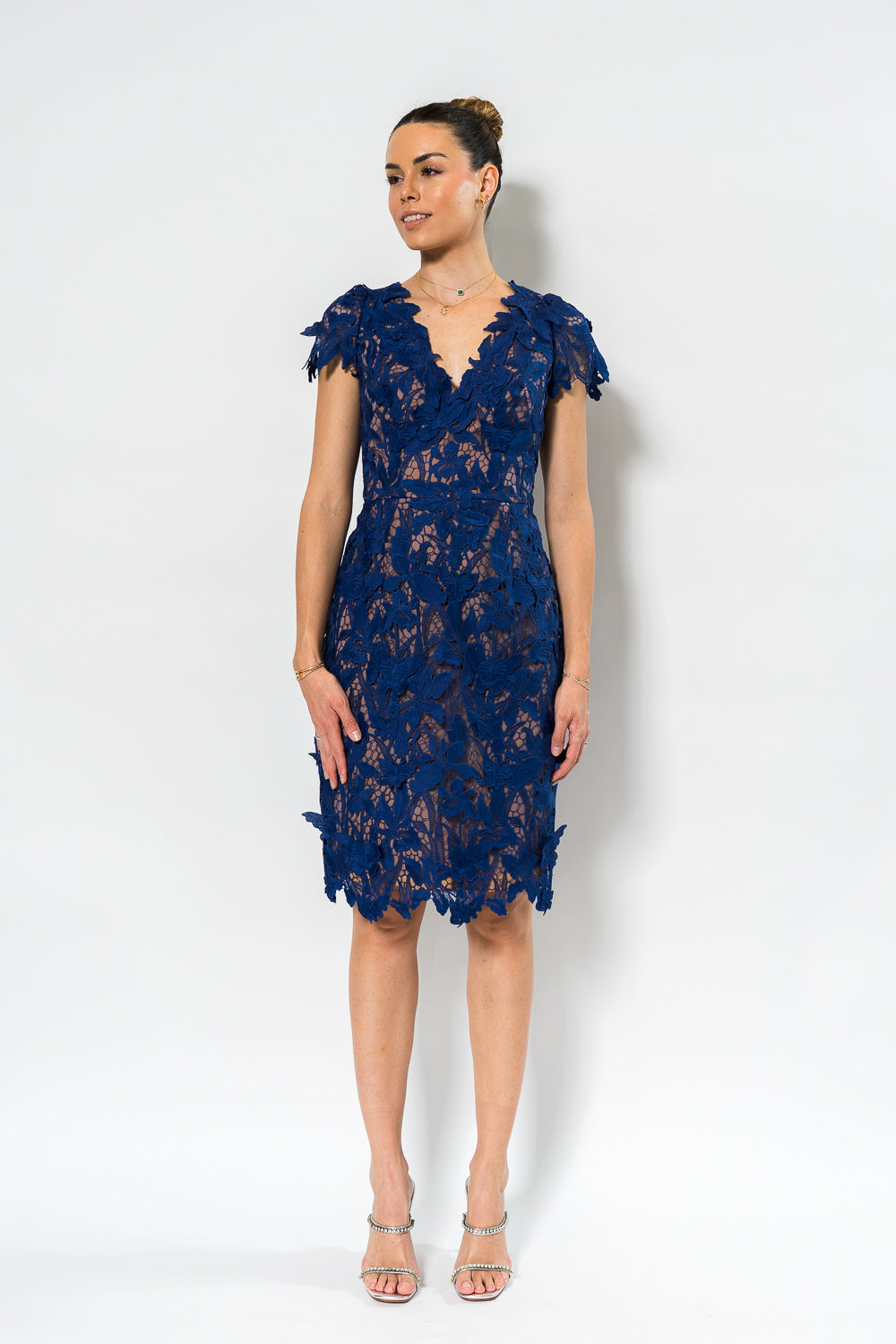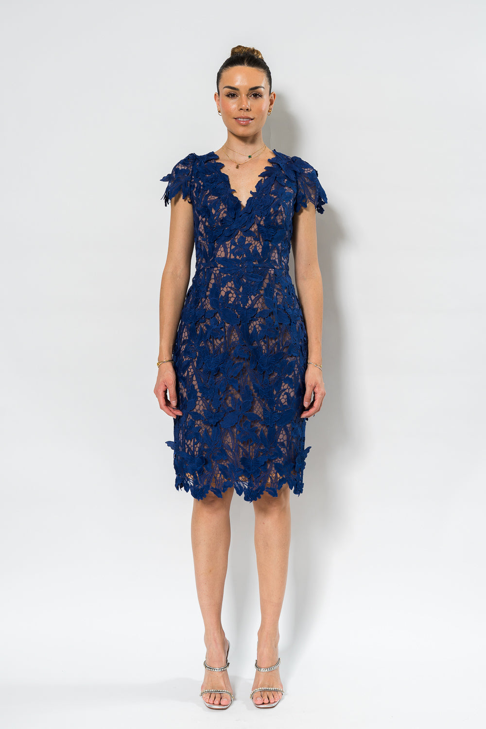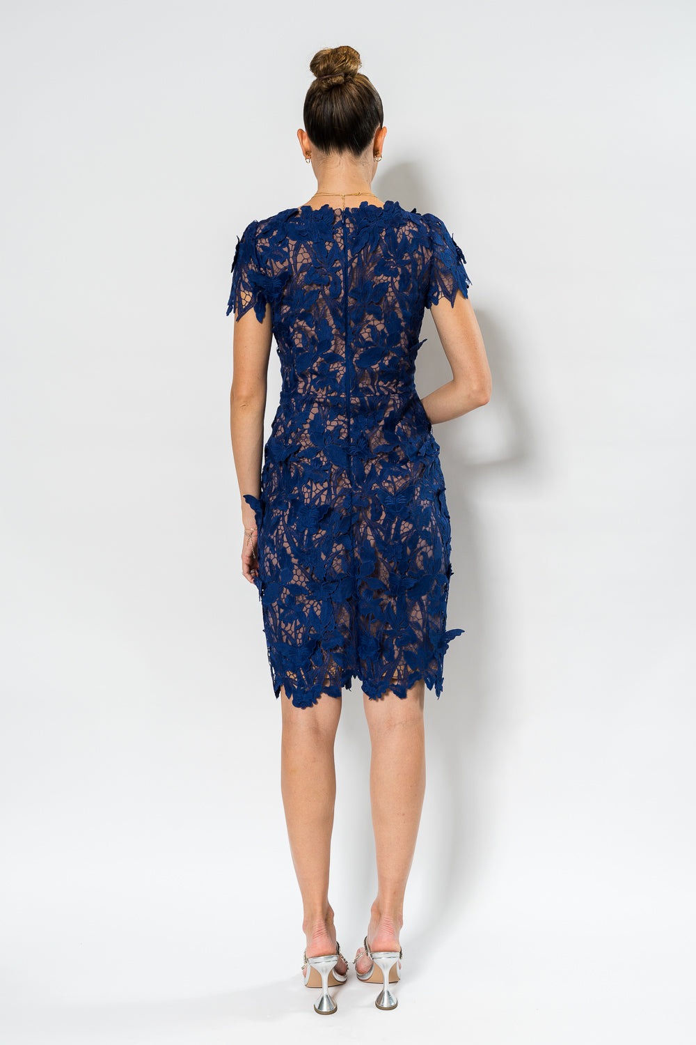 V-Neckline Lace Guipiure Mini With 3-D Appliques and Short Sleeves in Navy by Marchesa Notte.