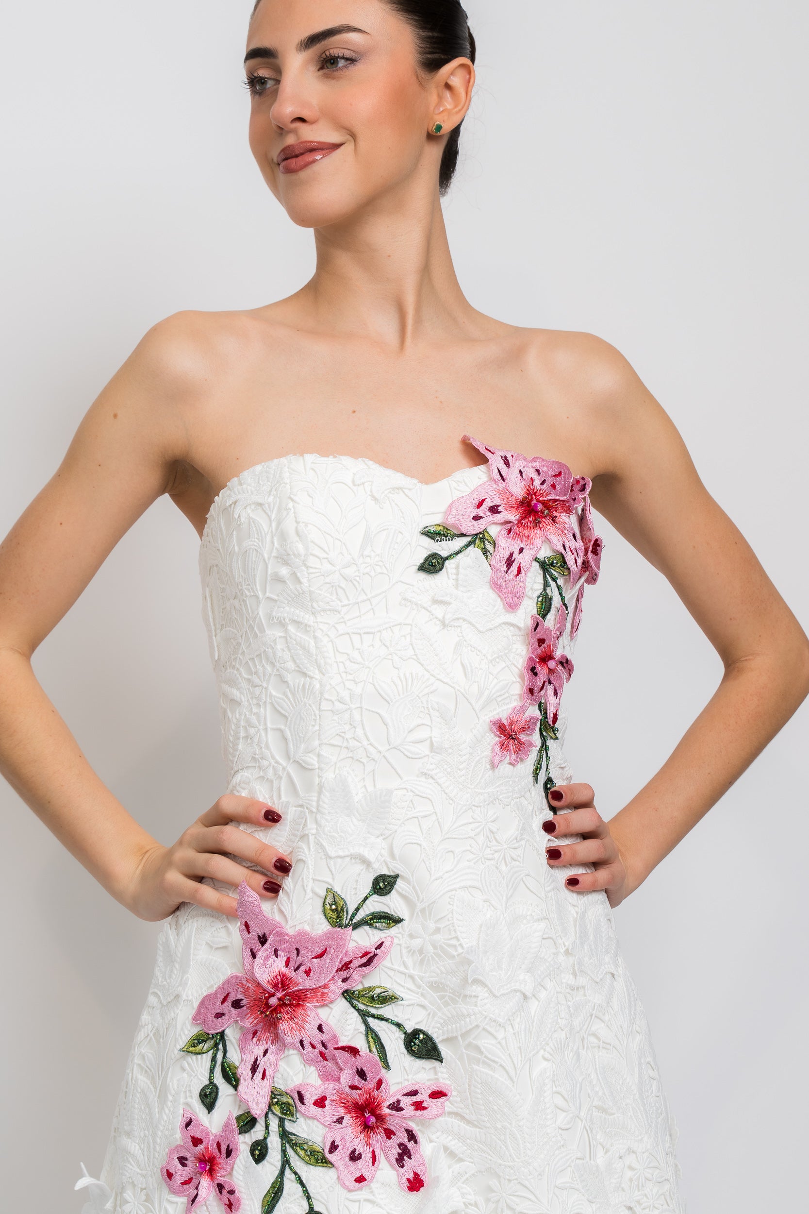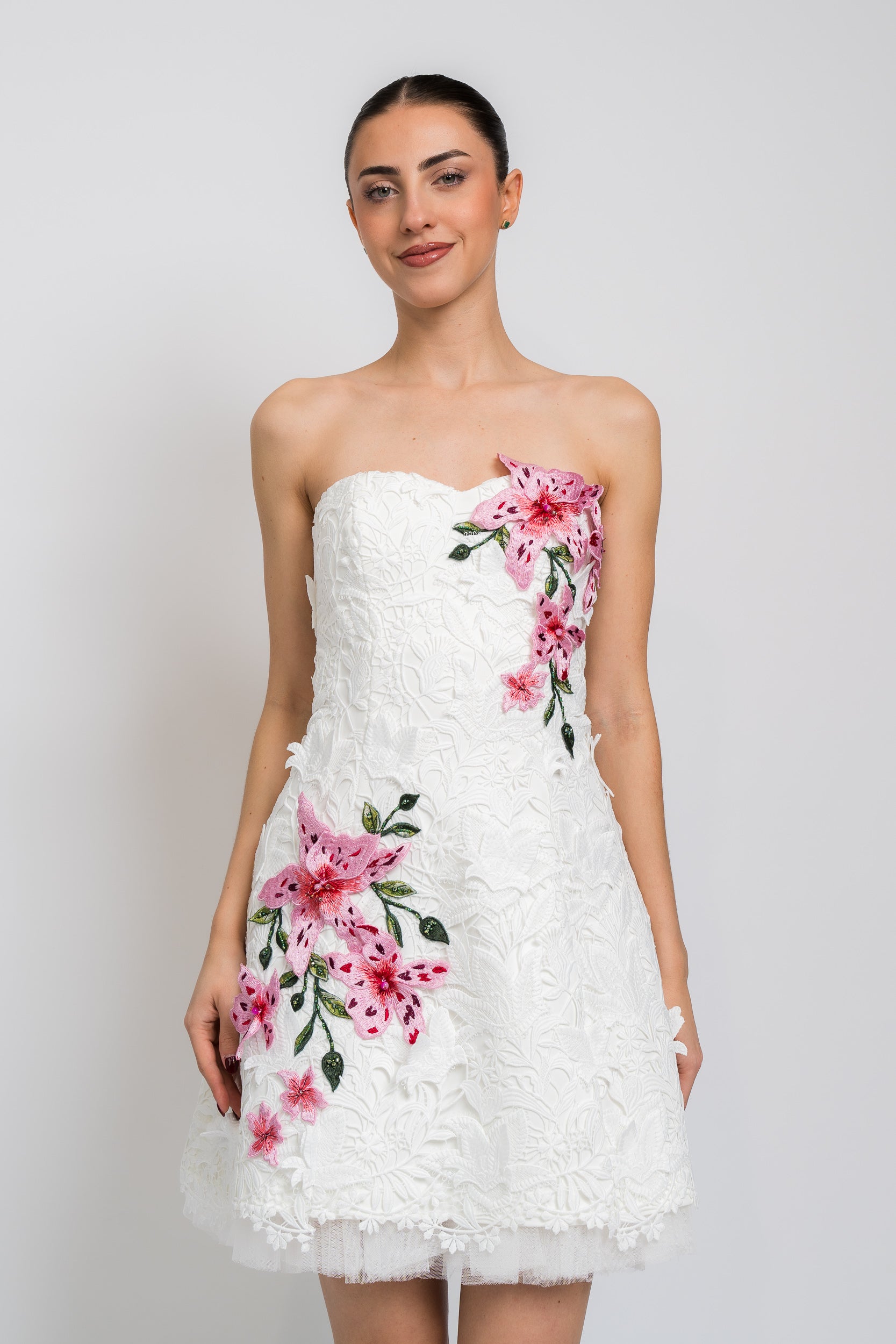 Strapless Lace Applique Mini Dress in White Multi by Badgley Mischka.