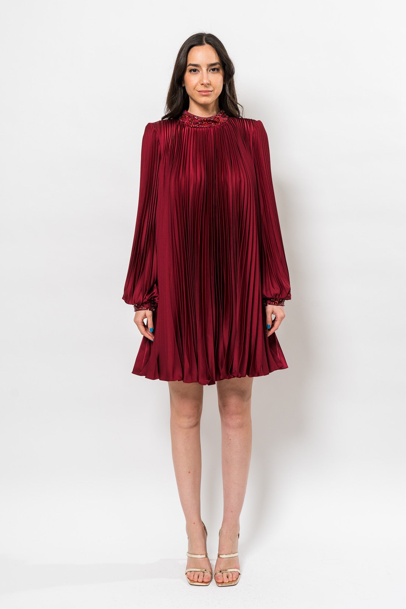 Long Sleeve Pleated Shift Dress in Wine by Badgley Mischka.