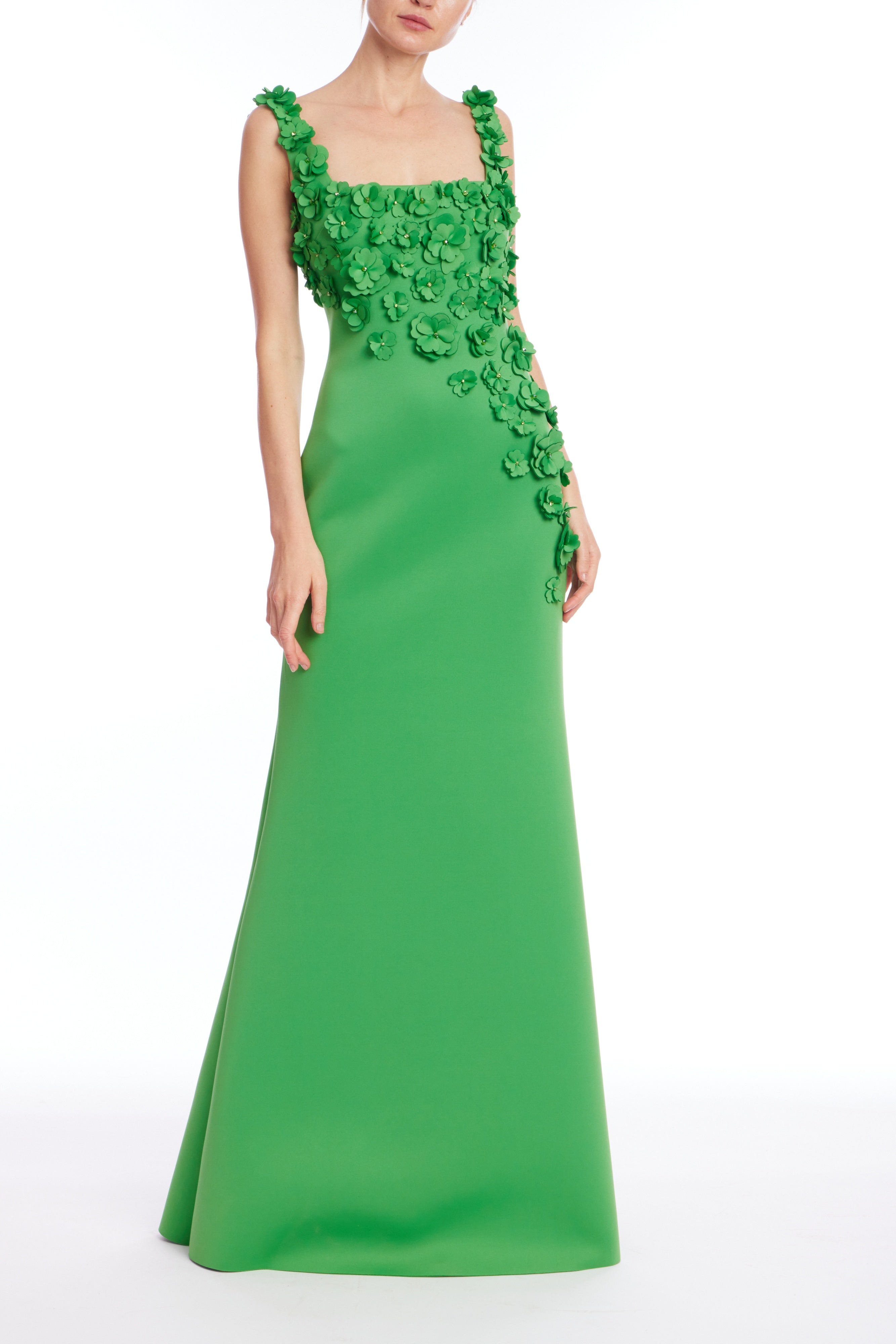 Square Neck Floral Applique A-Line Gown in Green by Badgley Mischka.