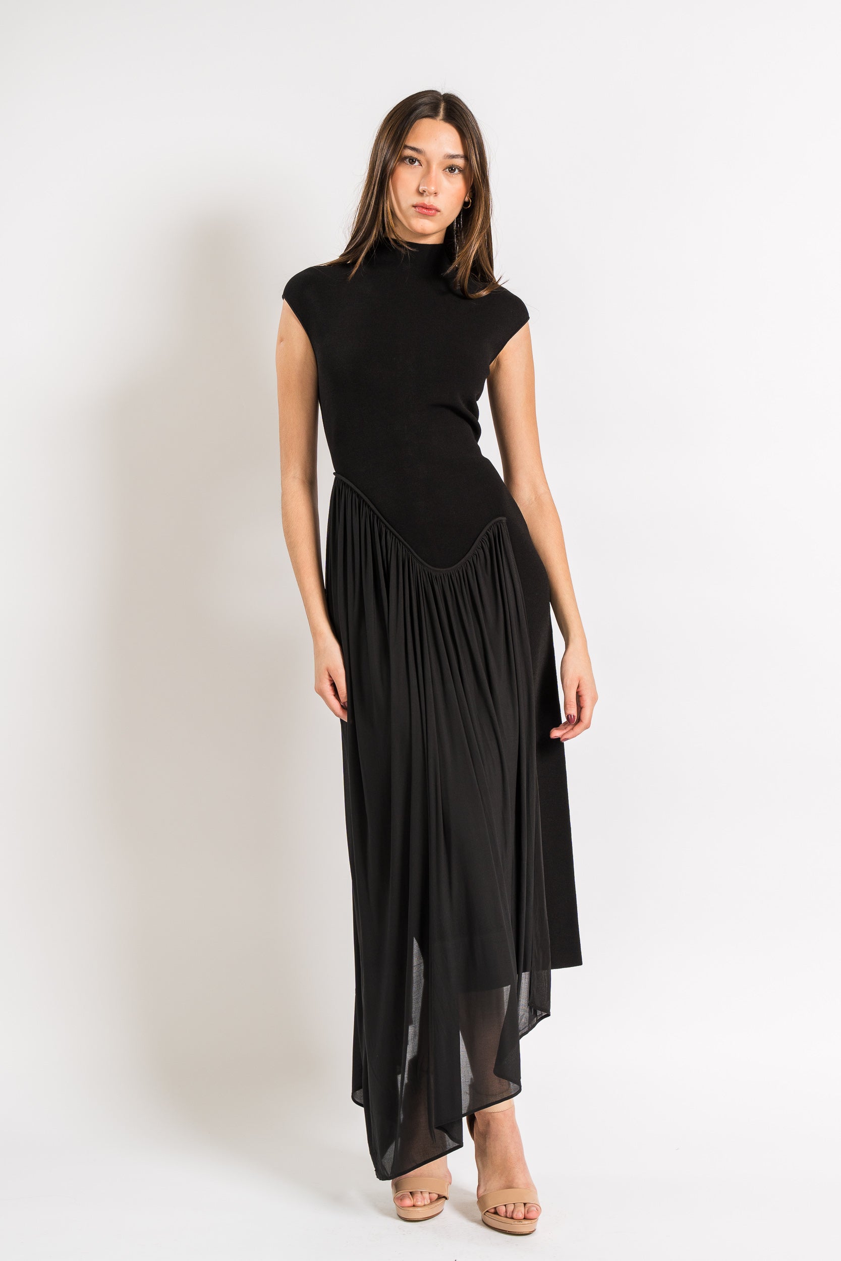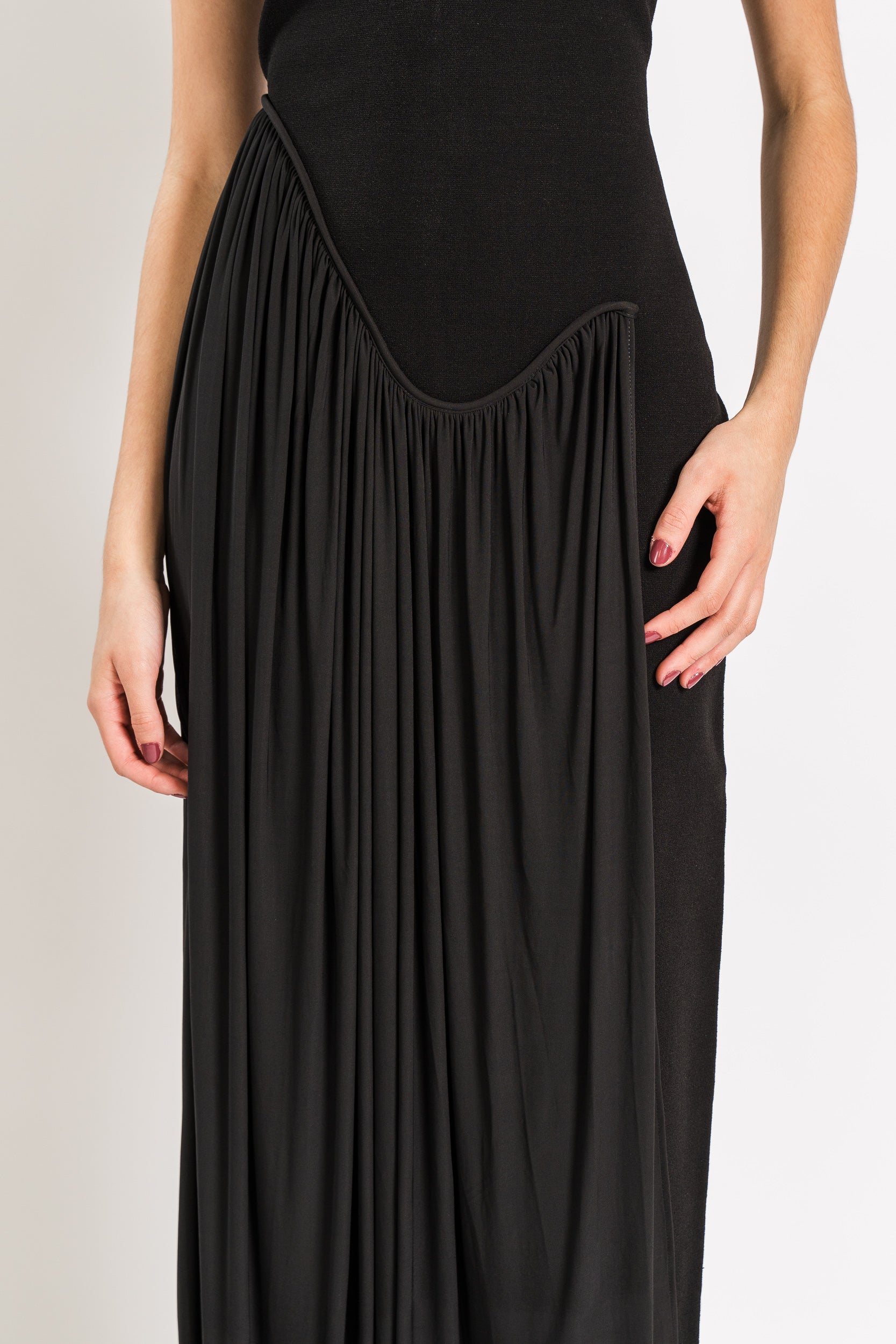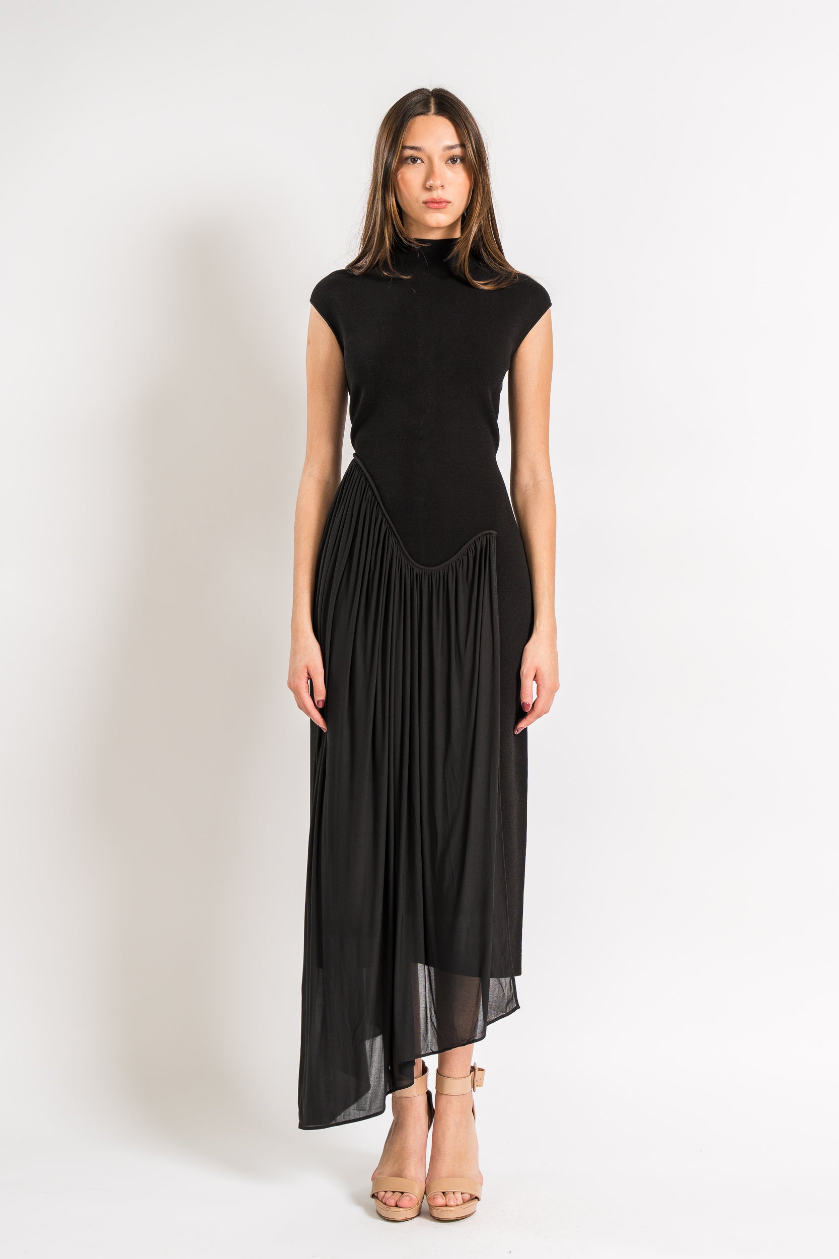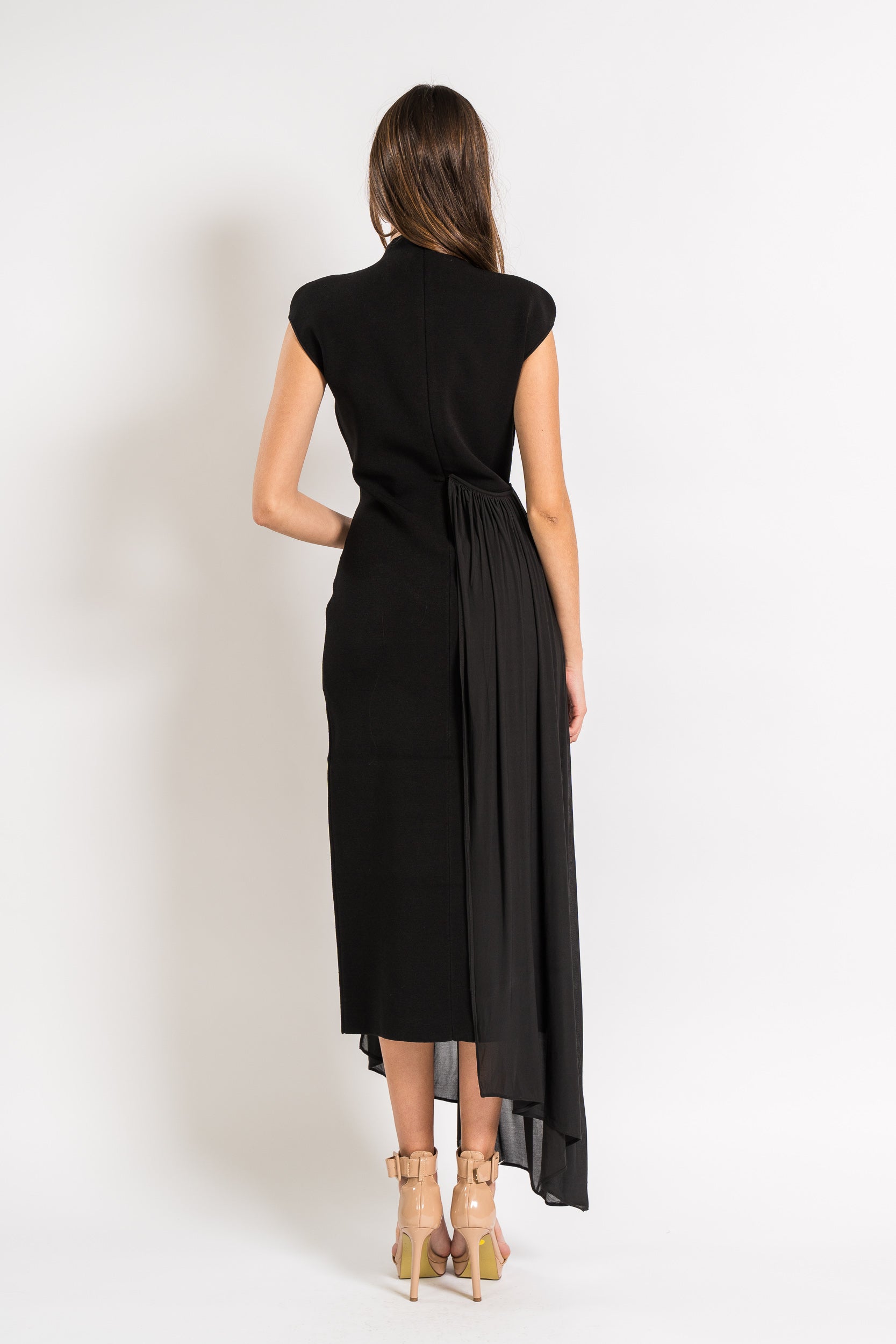Sleeveless Midi Dress with Asymmetrical Drape in Compact Knit and Lightweight Jersey in Black by Et Ochs.
