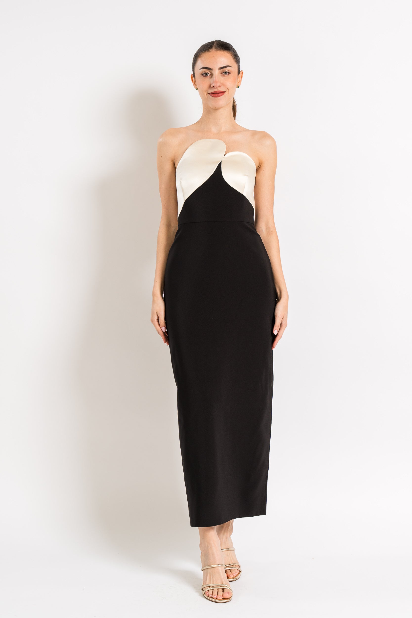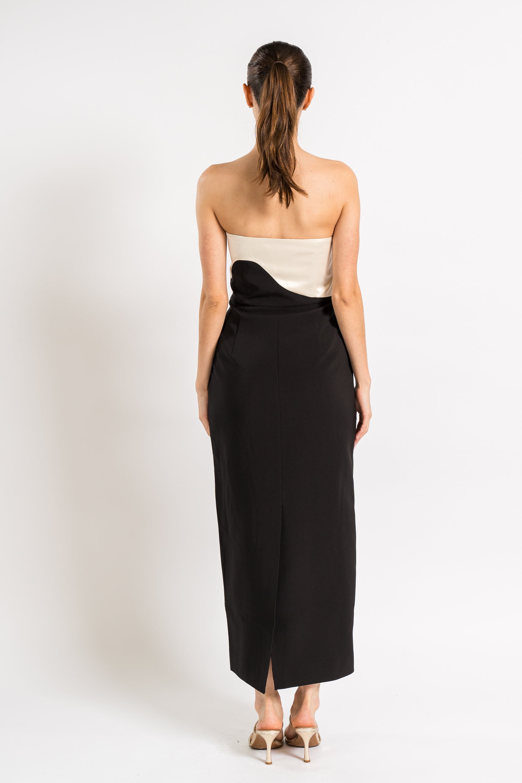 Asymmetrical Color-Block Midi Dress in Compact Cady and Duchess Satin in Black / Ivory by Et Ochs.