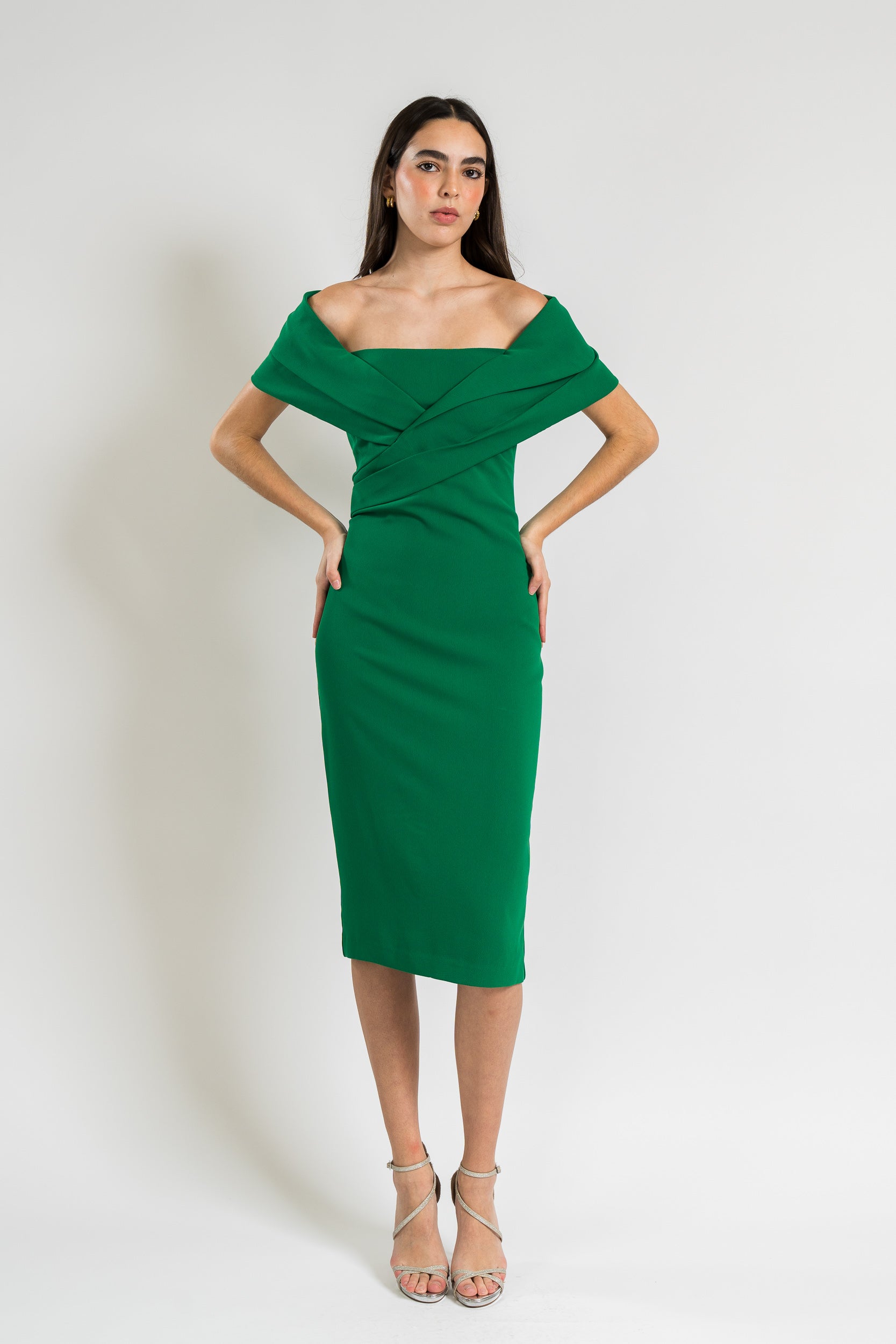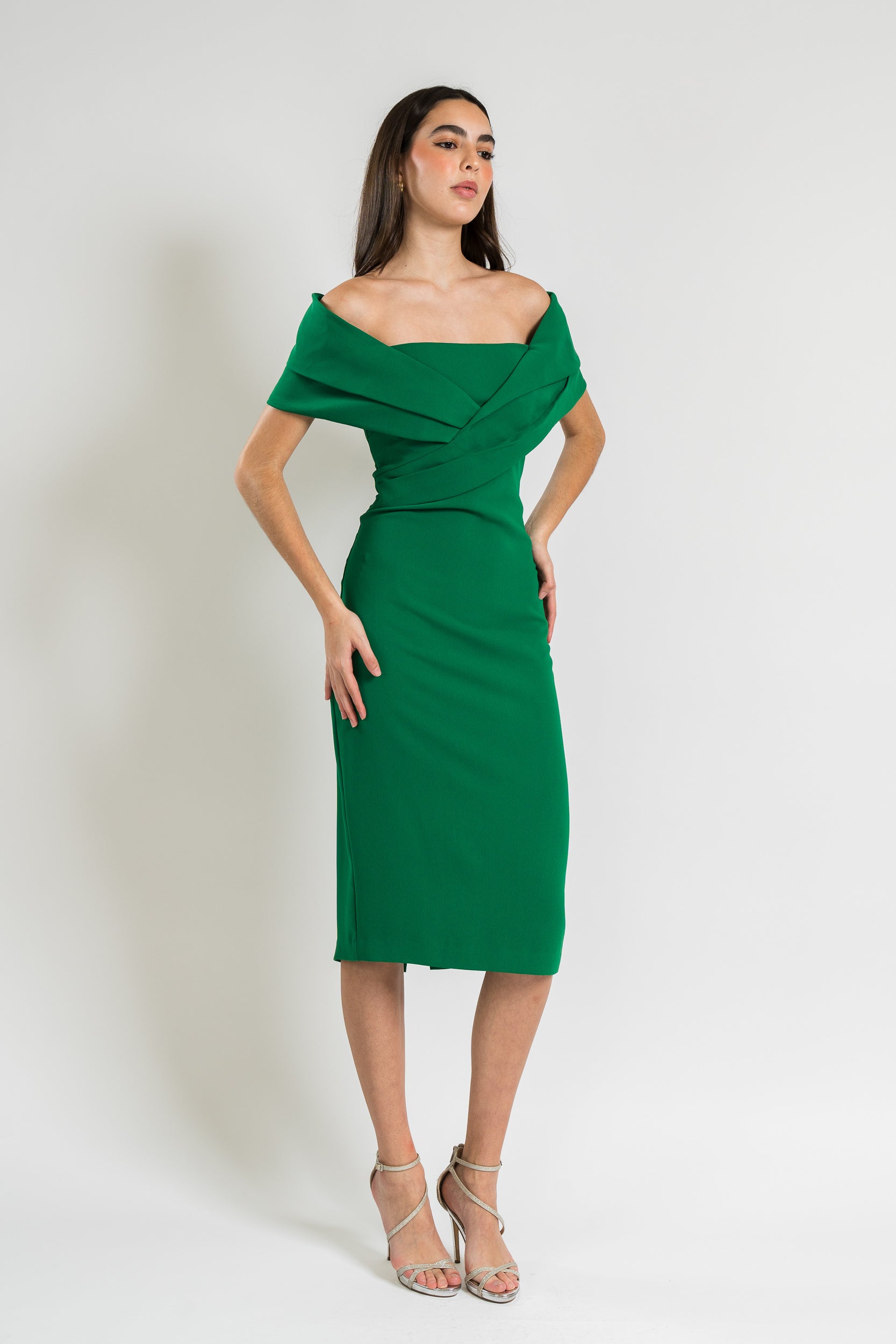Off Shoulder Draped Fitted Cocktail Dress in Emerald by Badgley Mischka.