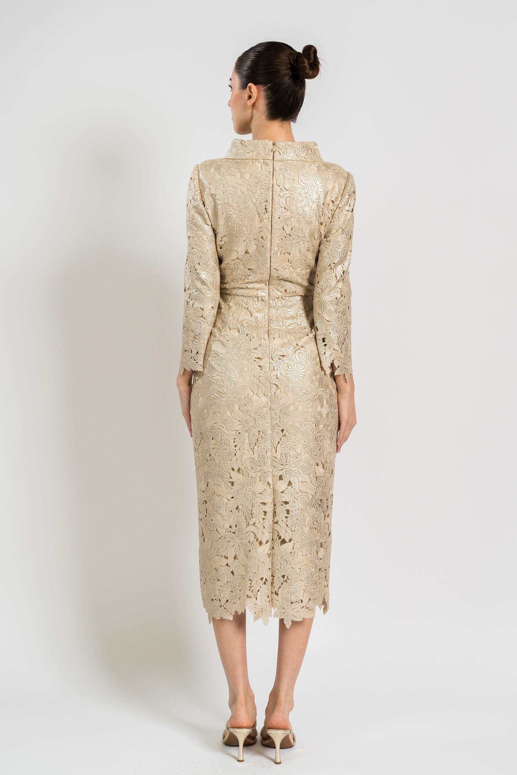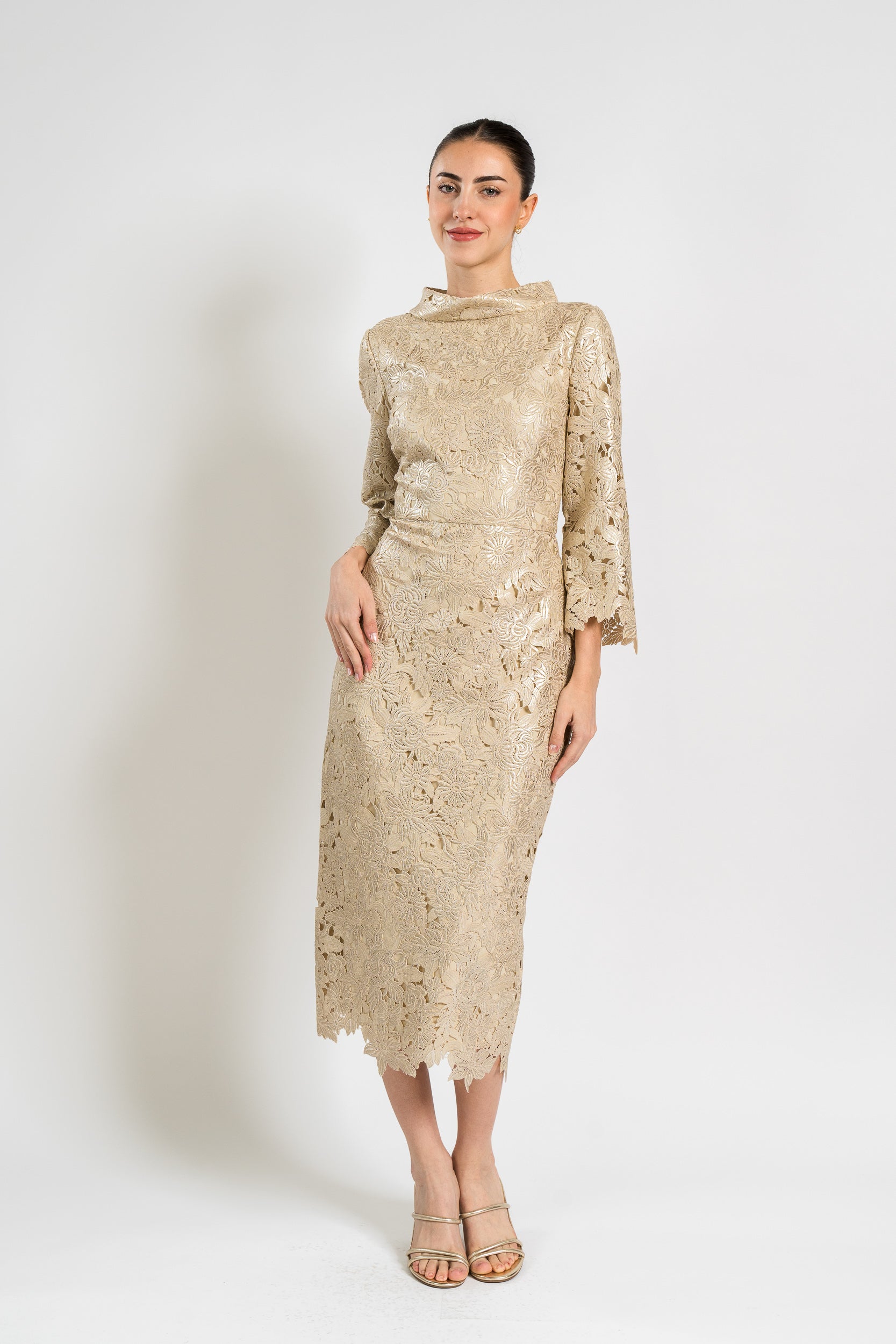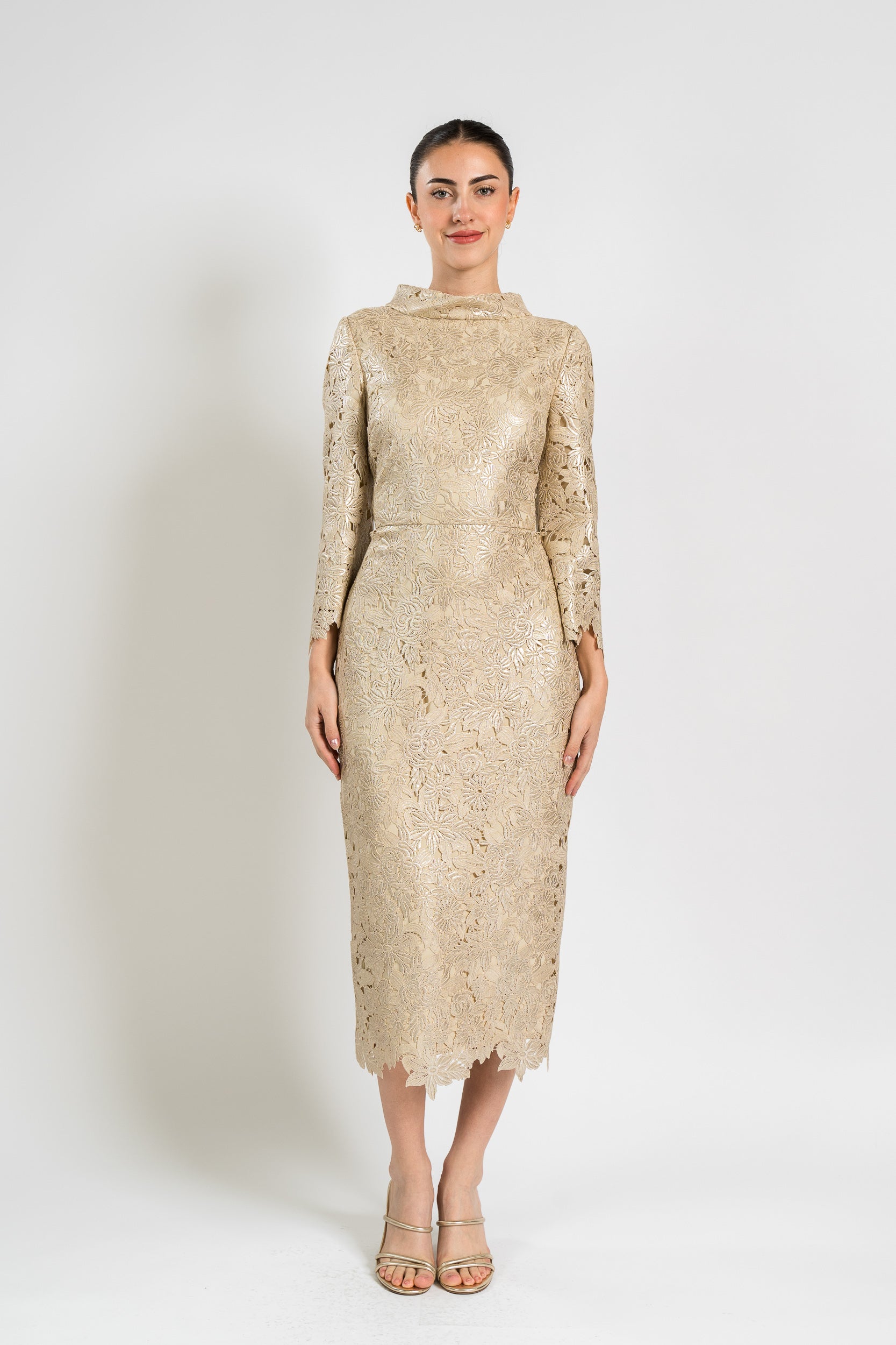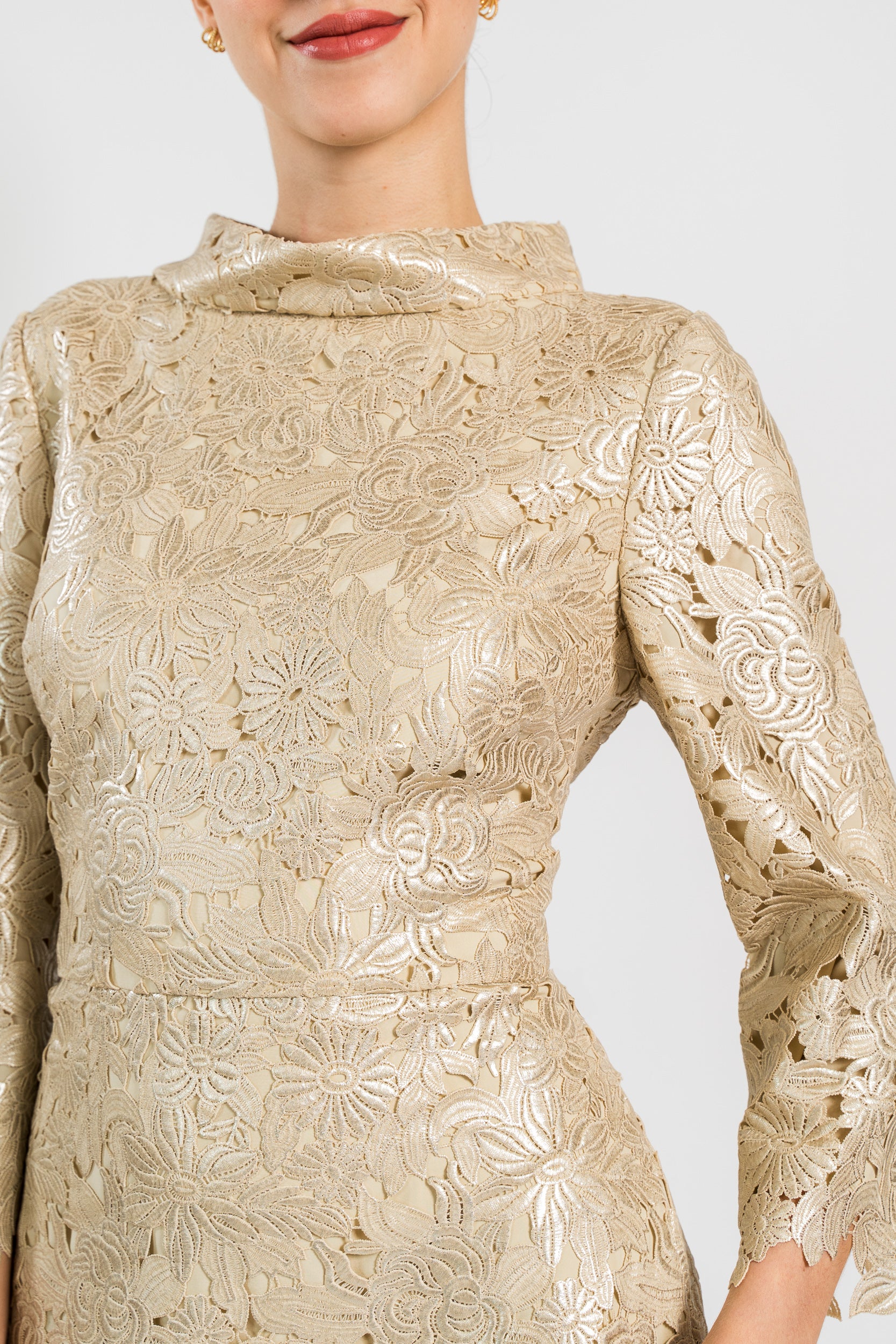 High Neck Long Sleeve Coctail Dress in Gold by Badgley Mischka.