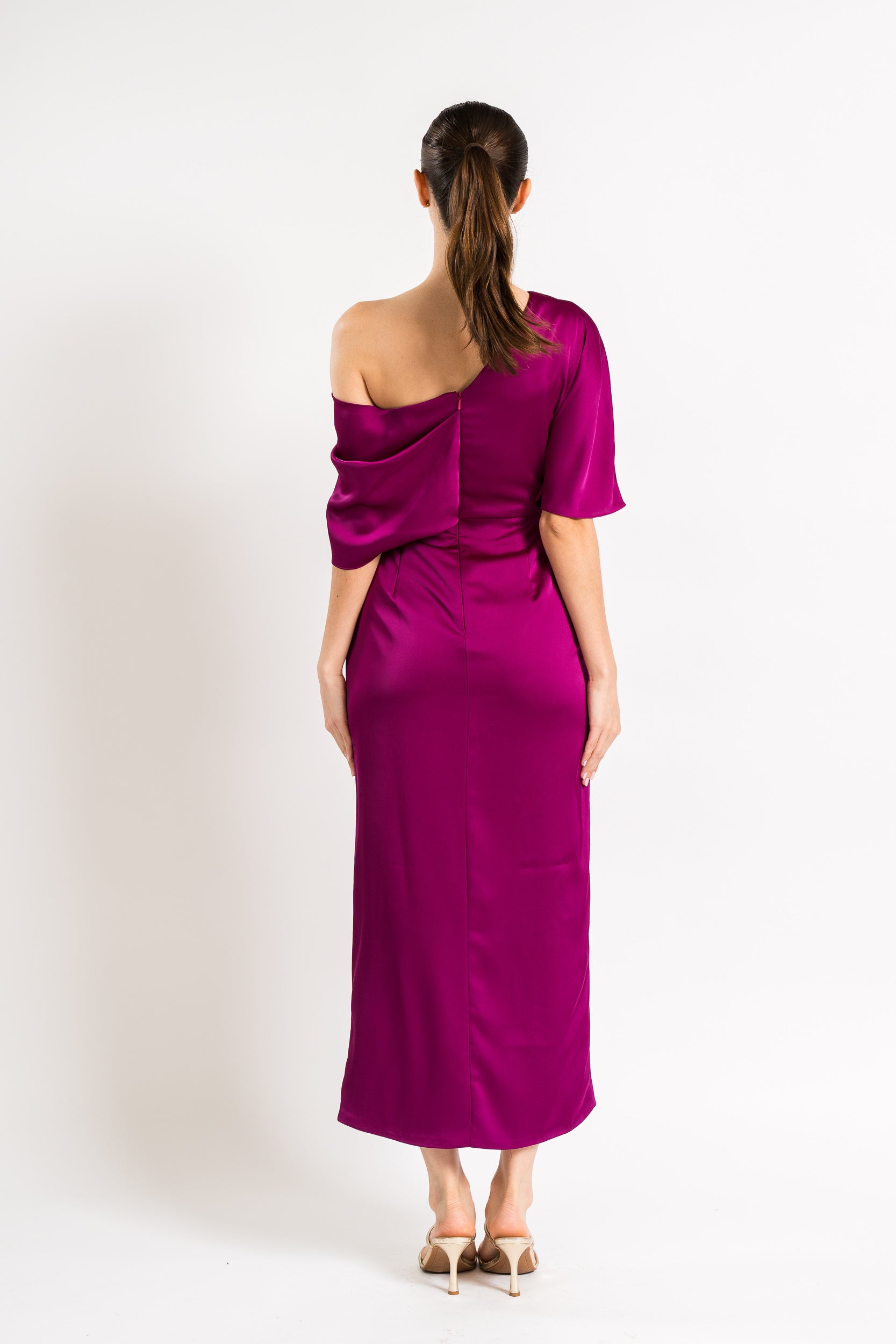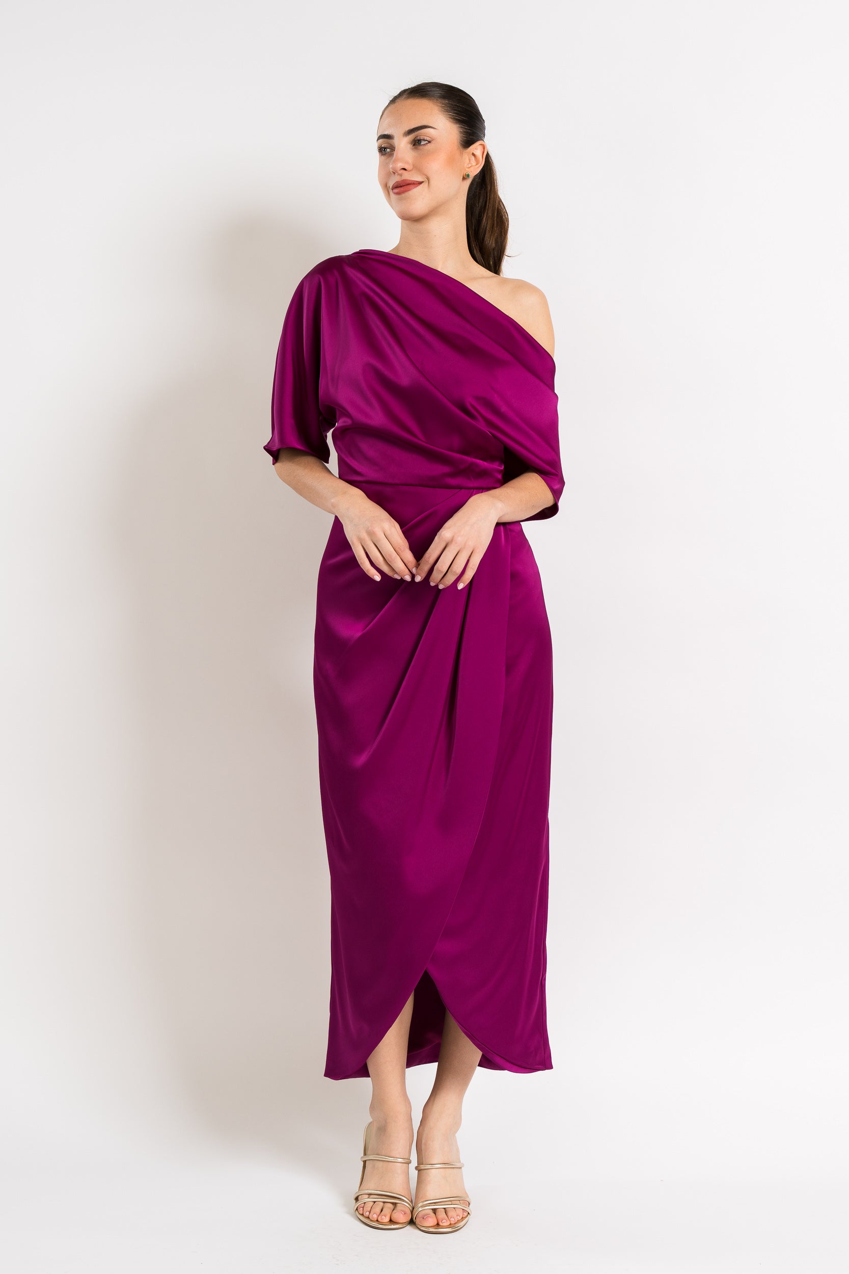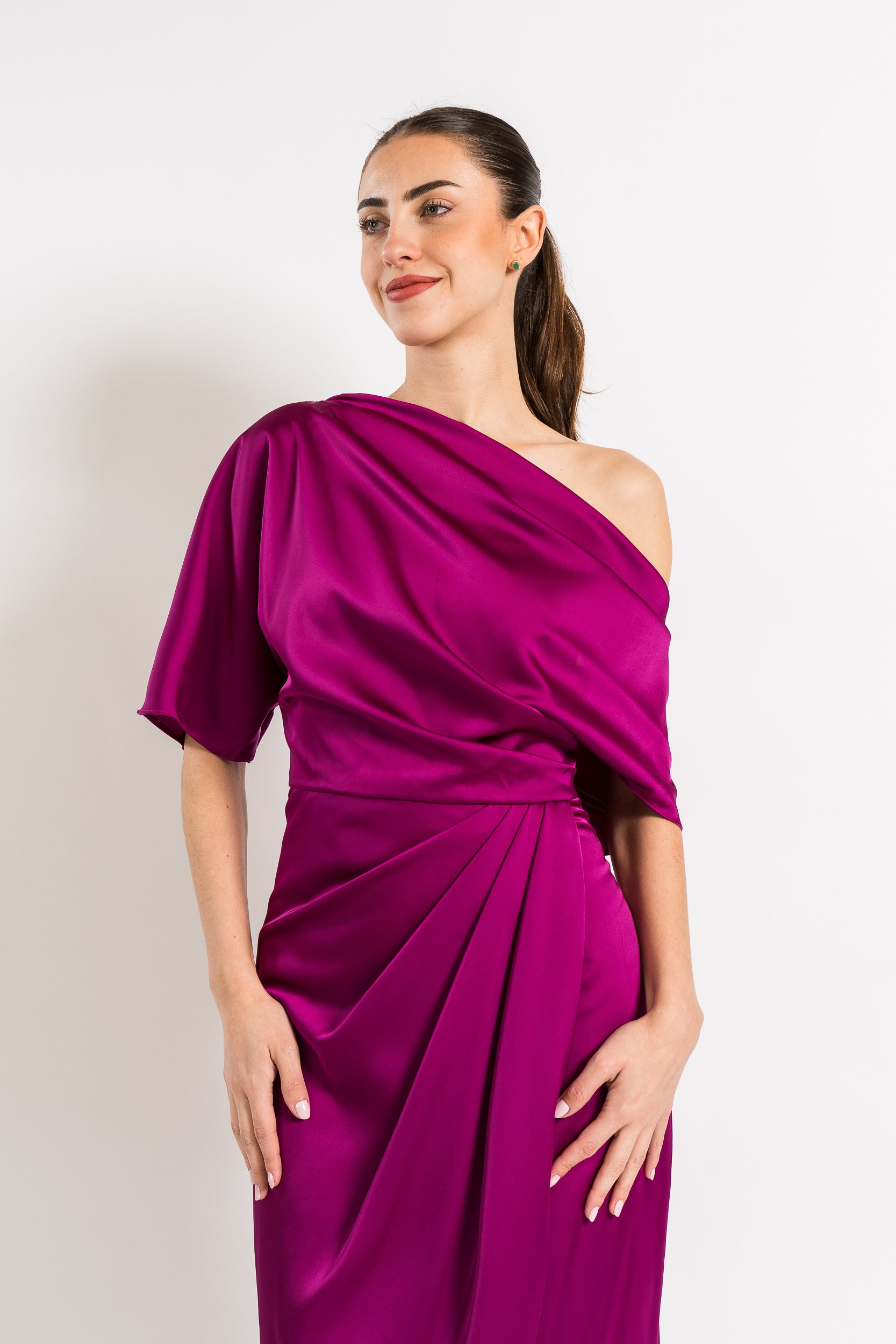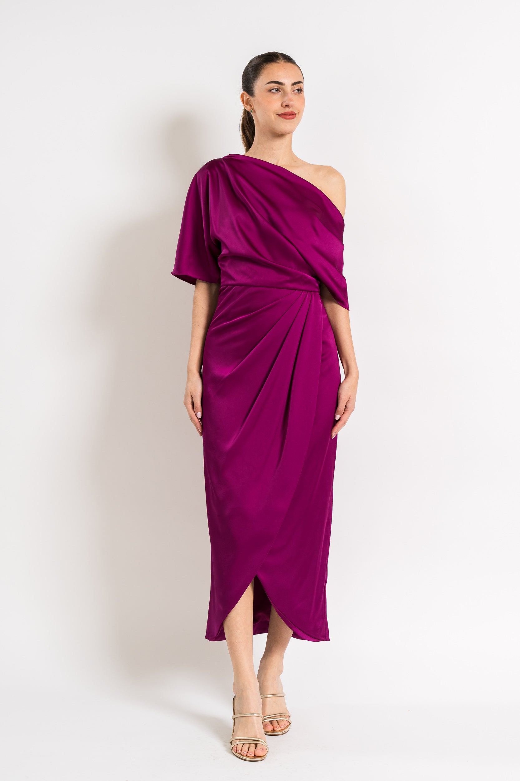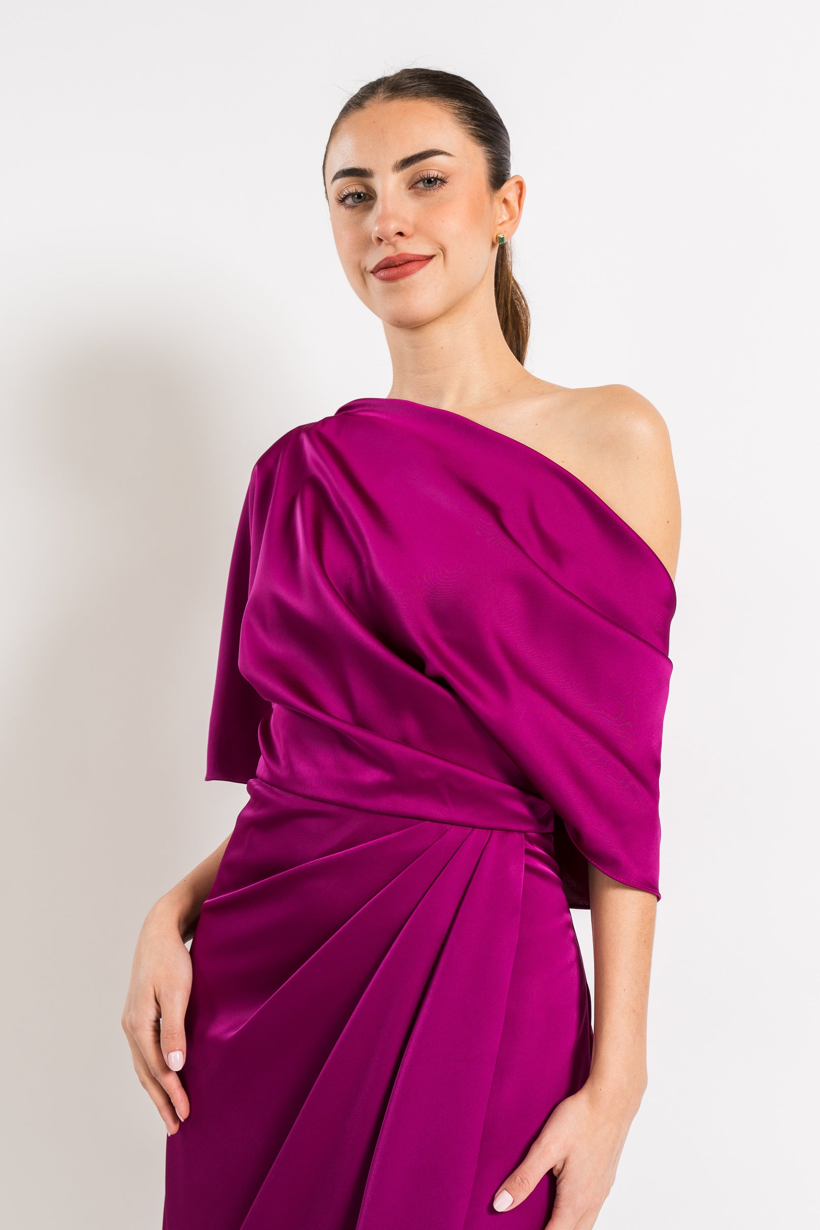 Satin Draped One Shoulder Gown With Faux Wrap Skirt in Sangria by Theia.