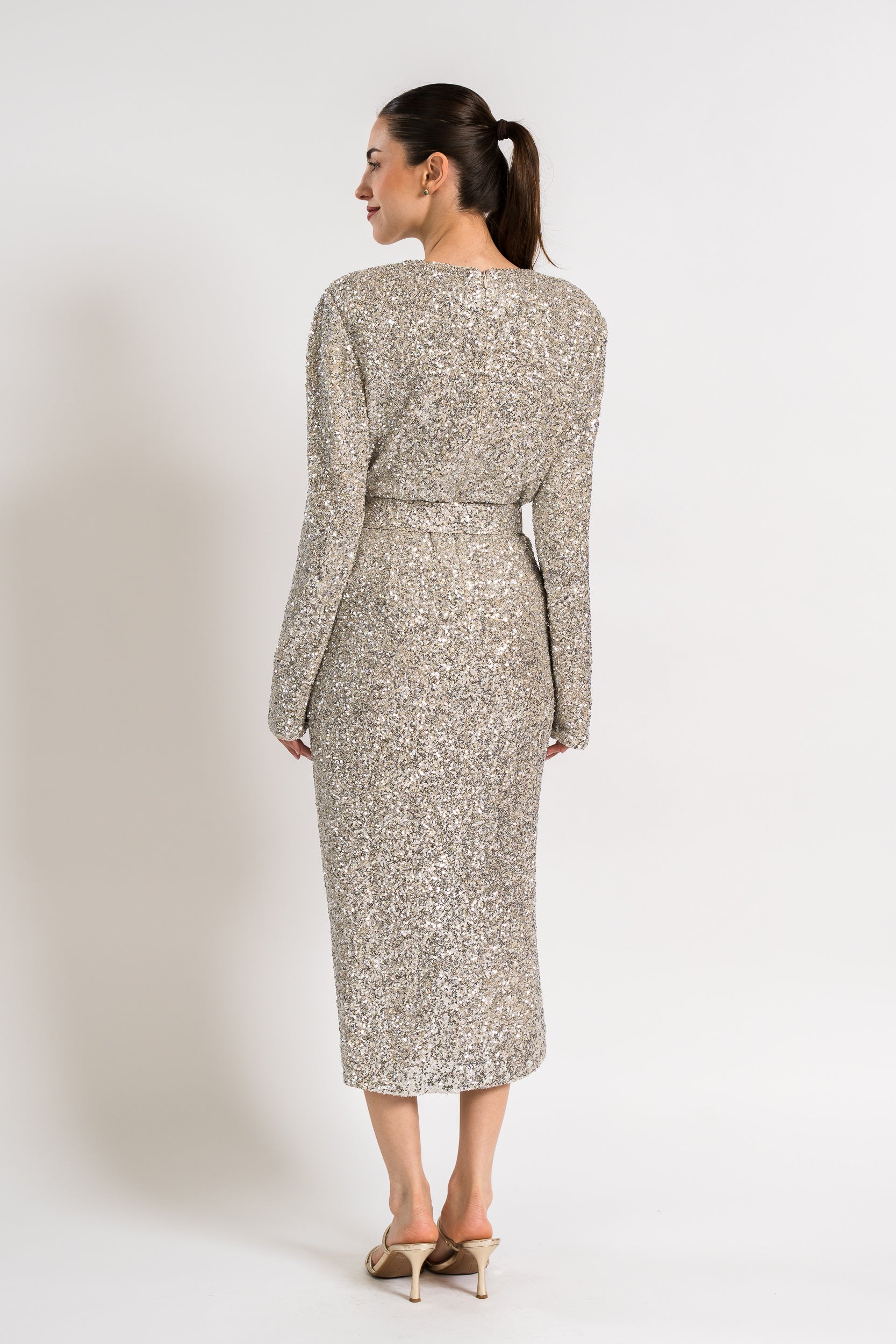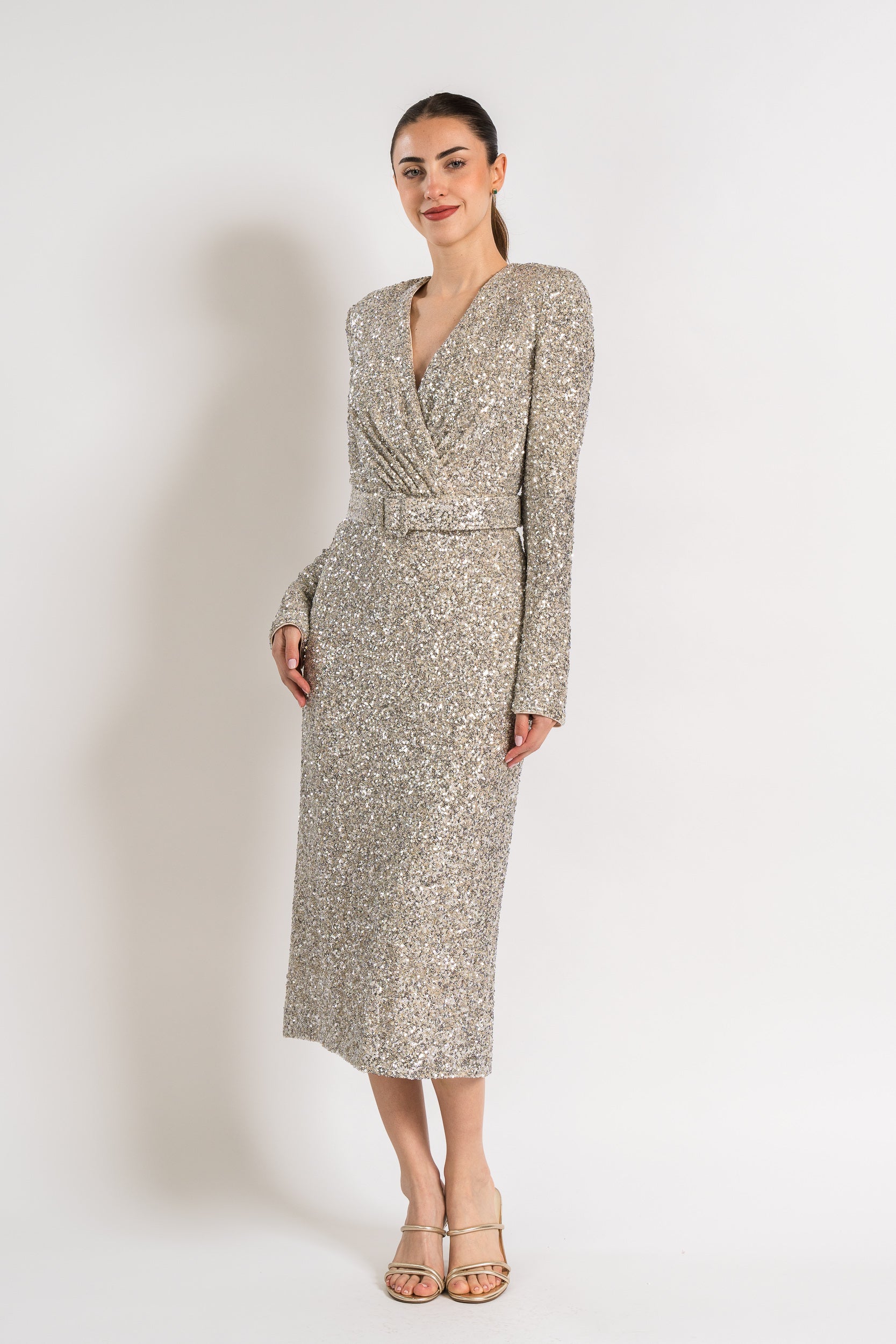 Long Sleeve Sequin Belted Midi Dress in Silver by Badgley Mischka.