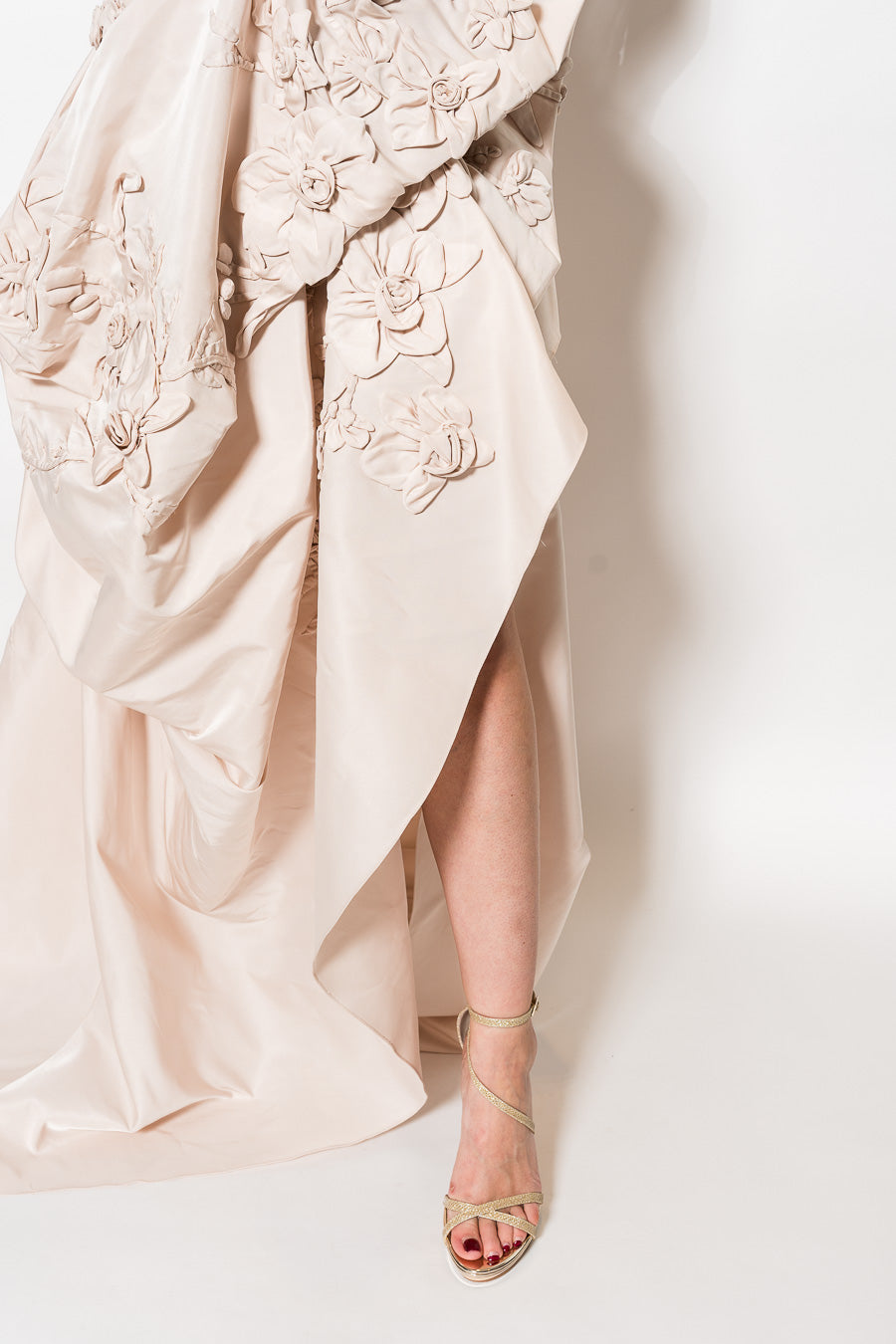 One Shoulder Illusion Tulle and Silk Gown with Exposed Hip Drape and Orchid Embroidery in Blush by Marchesa.
