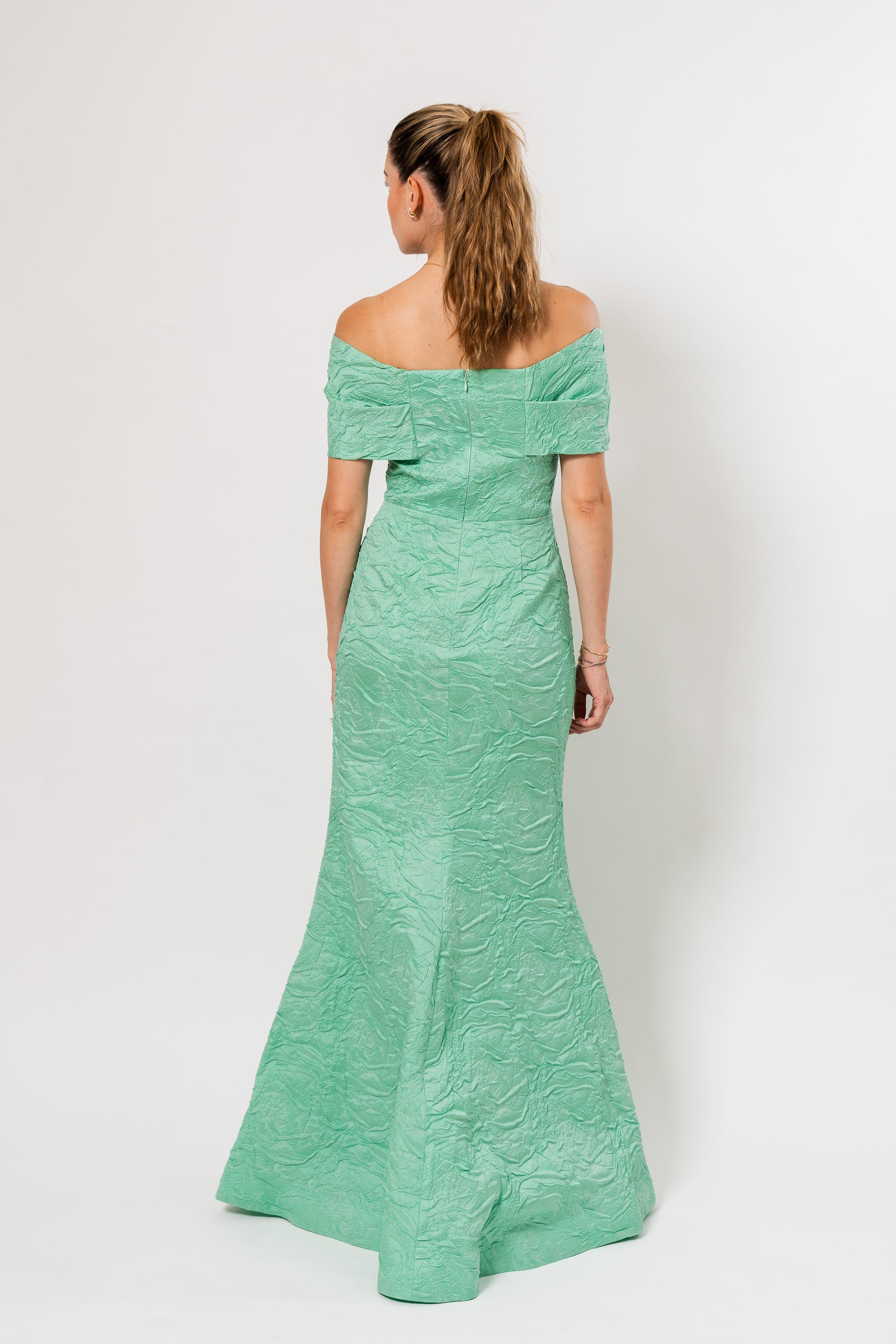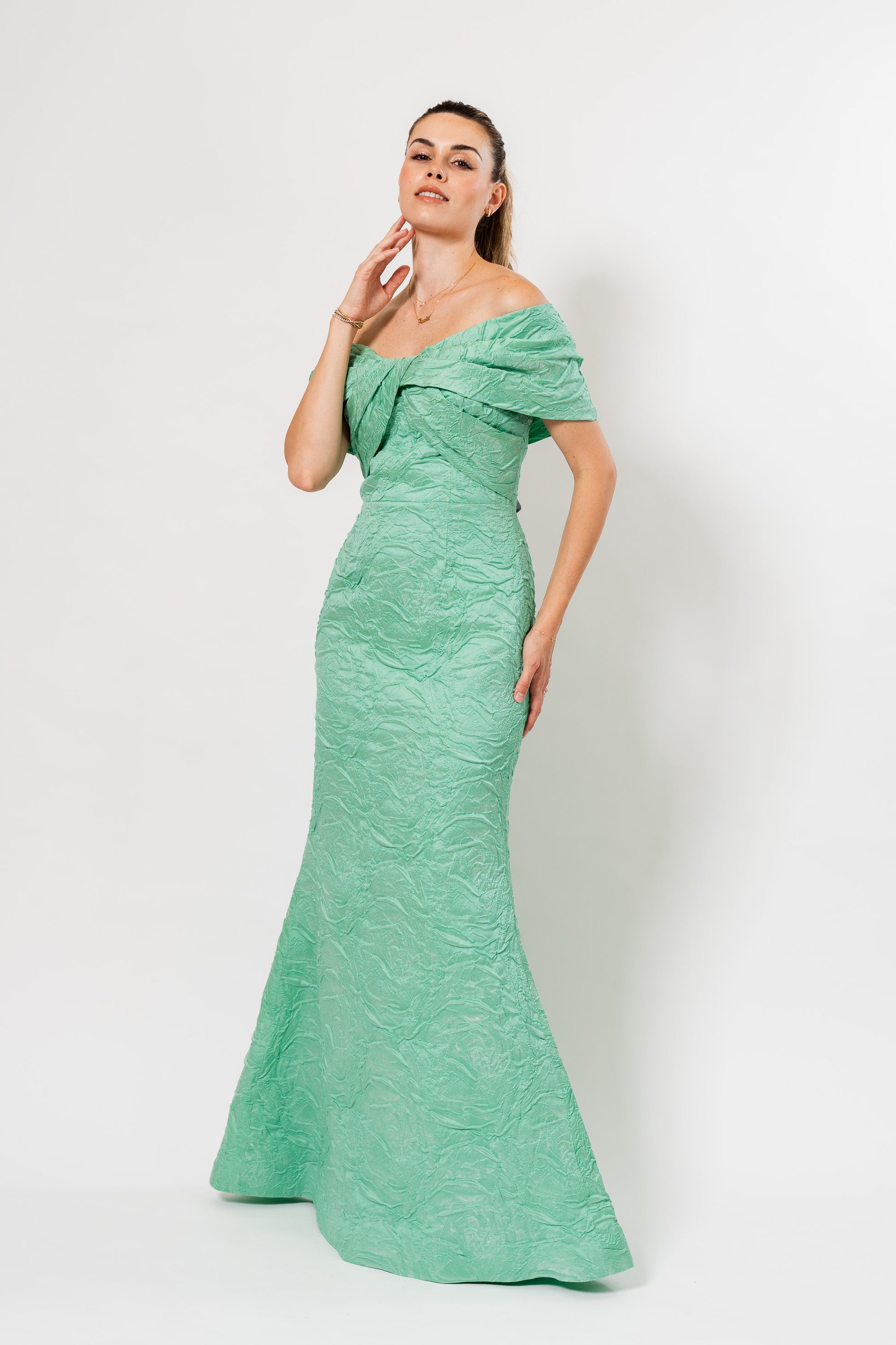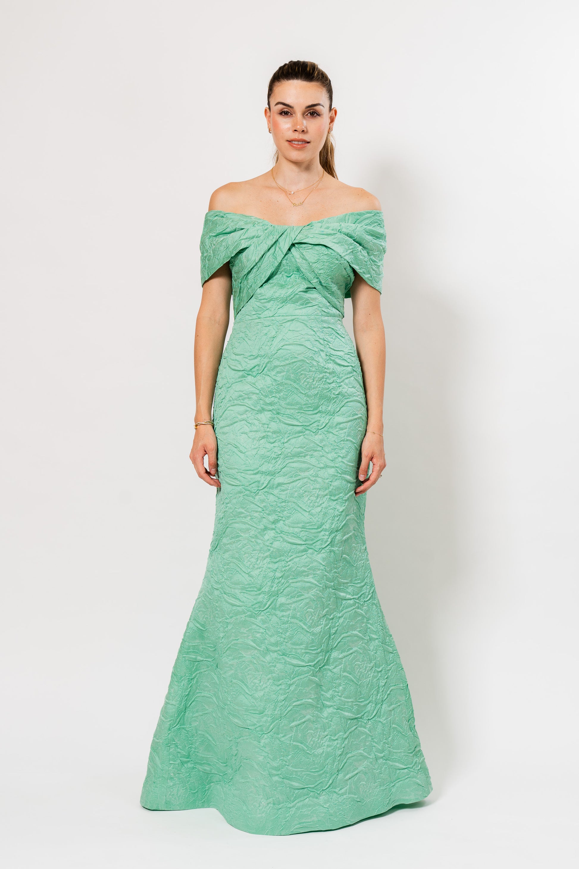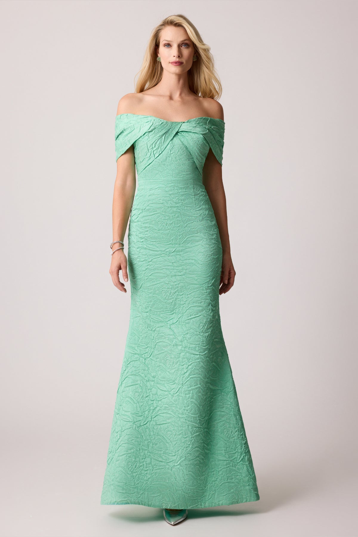 Embossed Jacquard Twist Bobice Gown in Mint Green by Teri Jon.