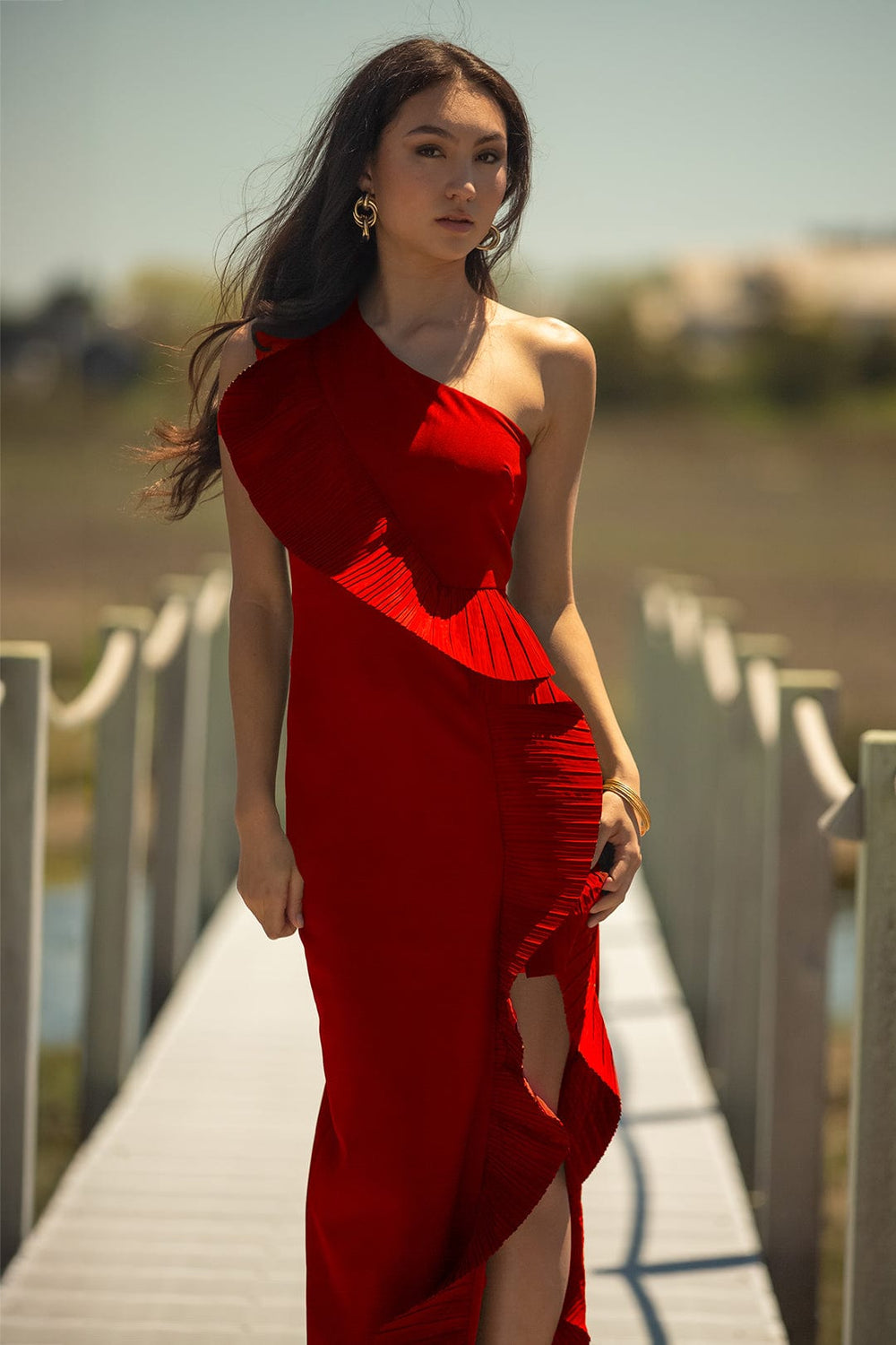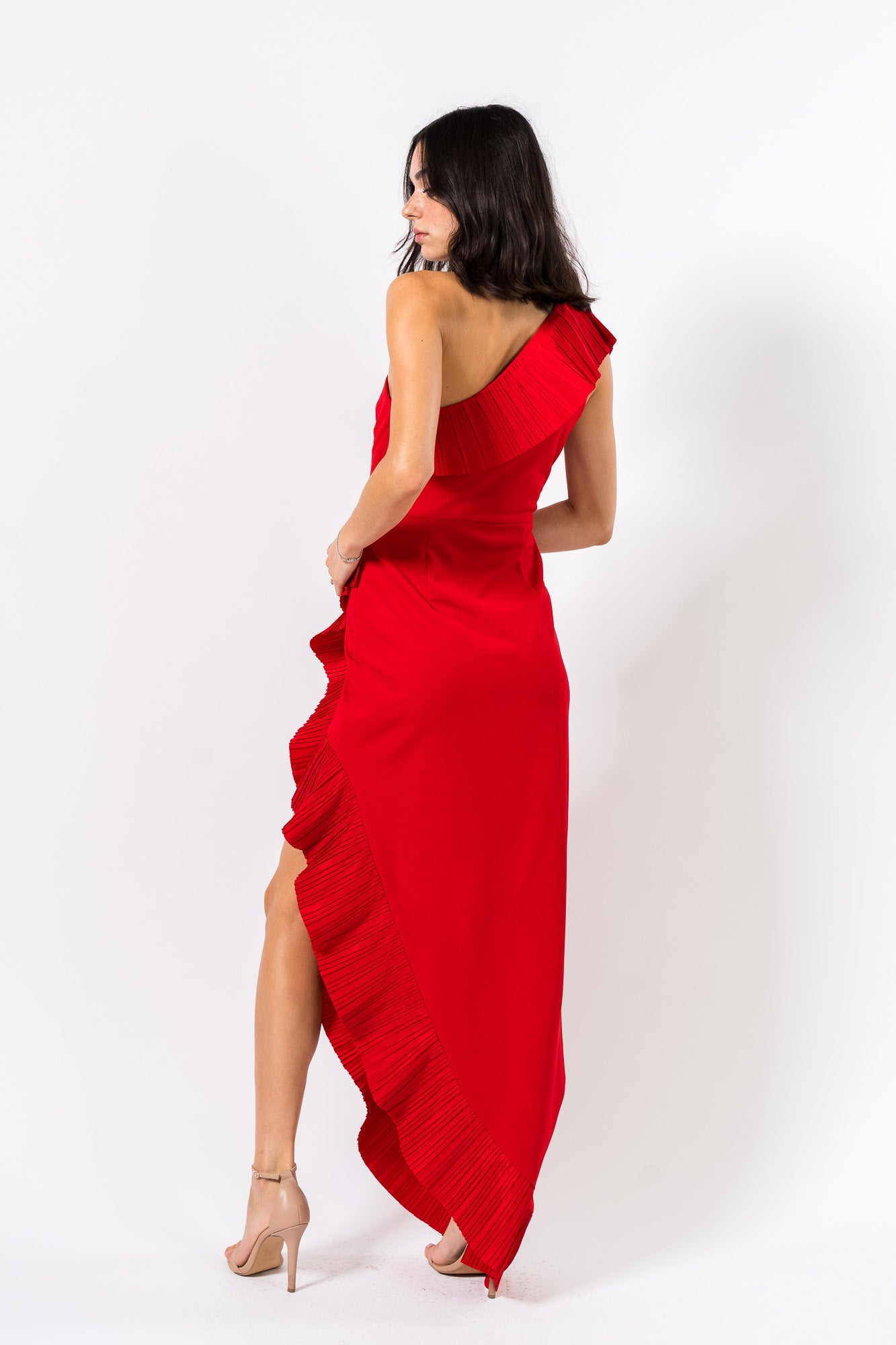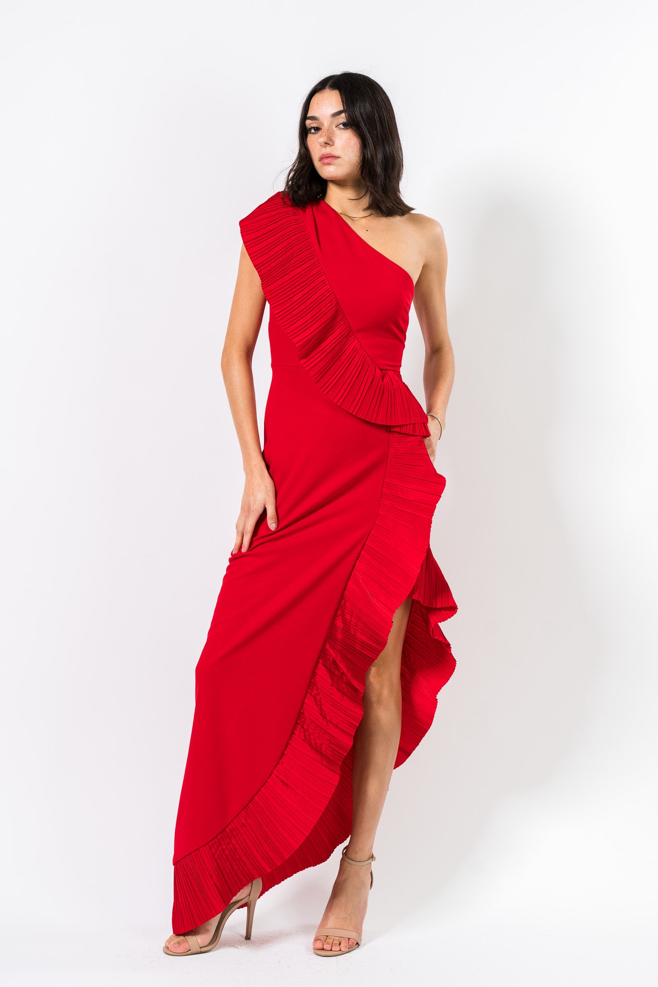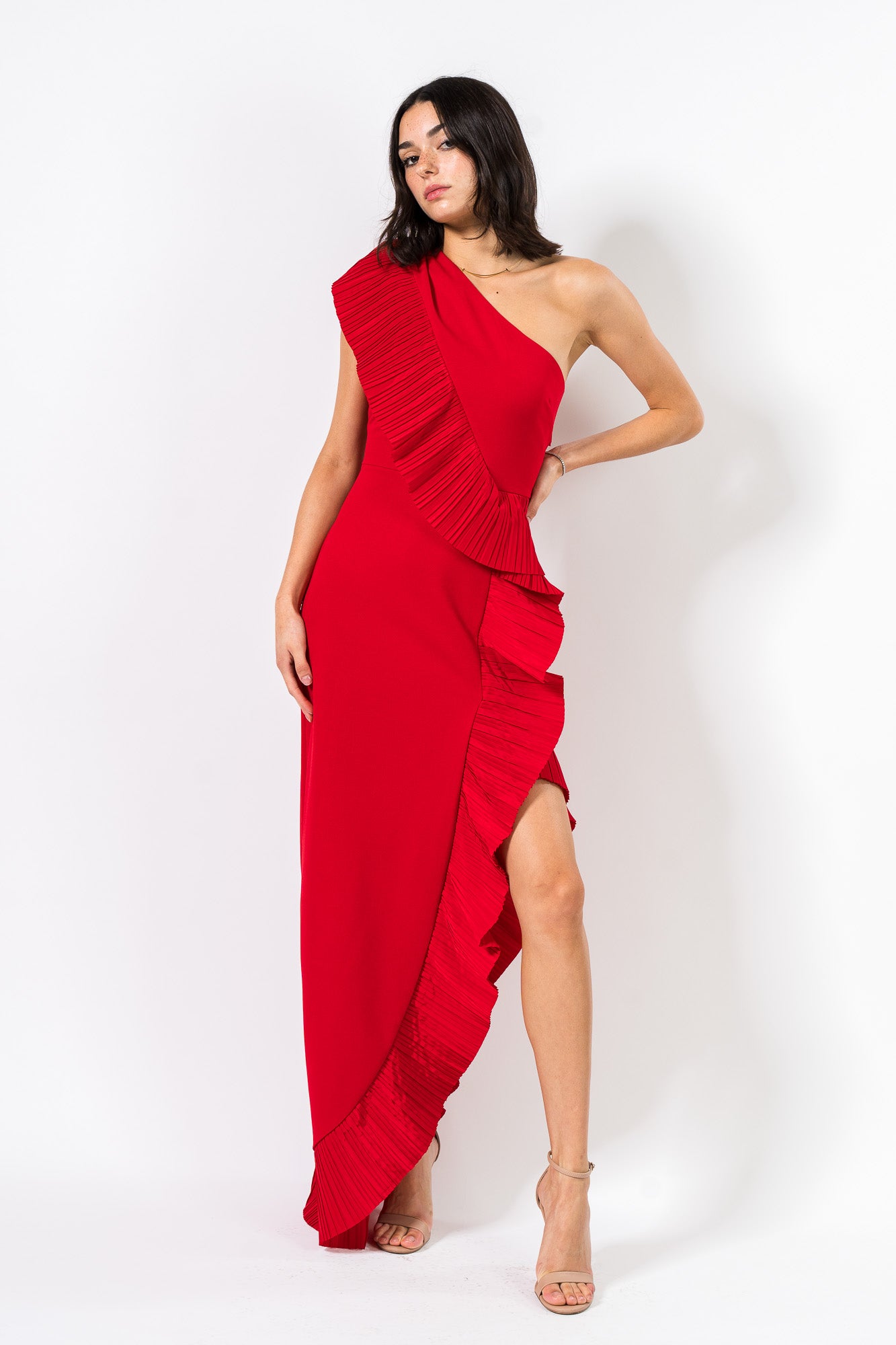 Pleated Ruffle Gown in Red by One33 Social.